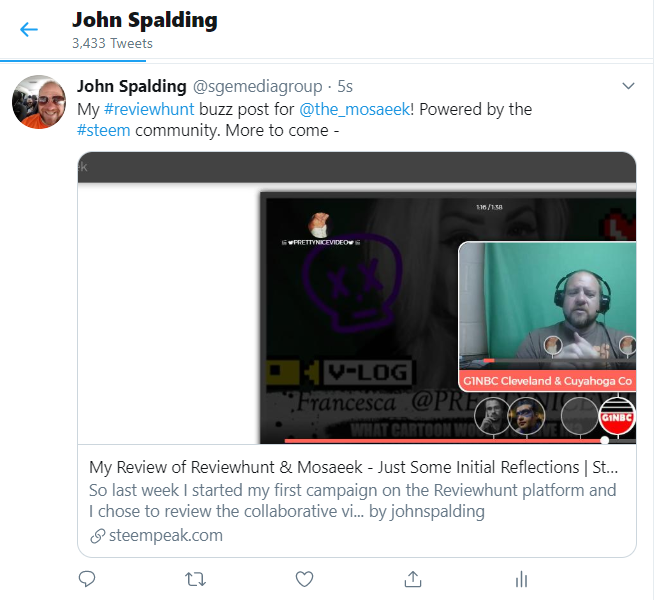 So last week I started my first campaign on the Reviewhunt platform and I chose to review the collaborative video app Mosaeek. Overall you were tasked with submitting a video on the Mosaeek App and getting some replies. Next you had to reply to someone else's video using the Mosaeek app. They reviewhunt asks you to share yourexperience with the product on your social media channels. I chose #steem and #twitter.