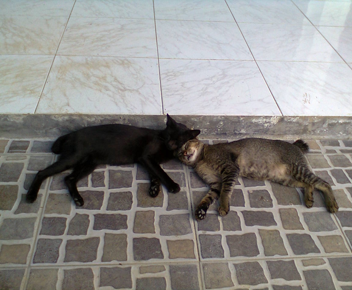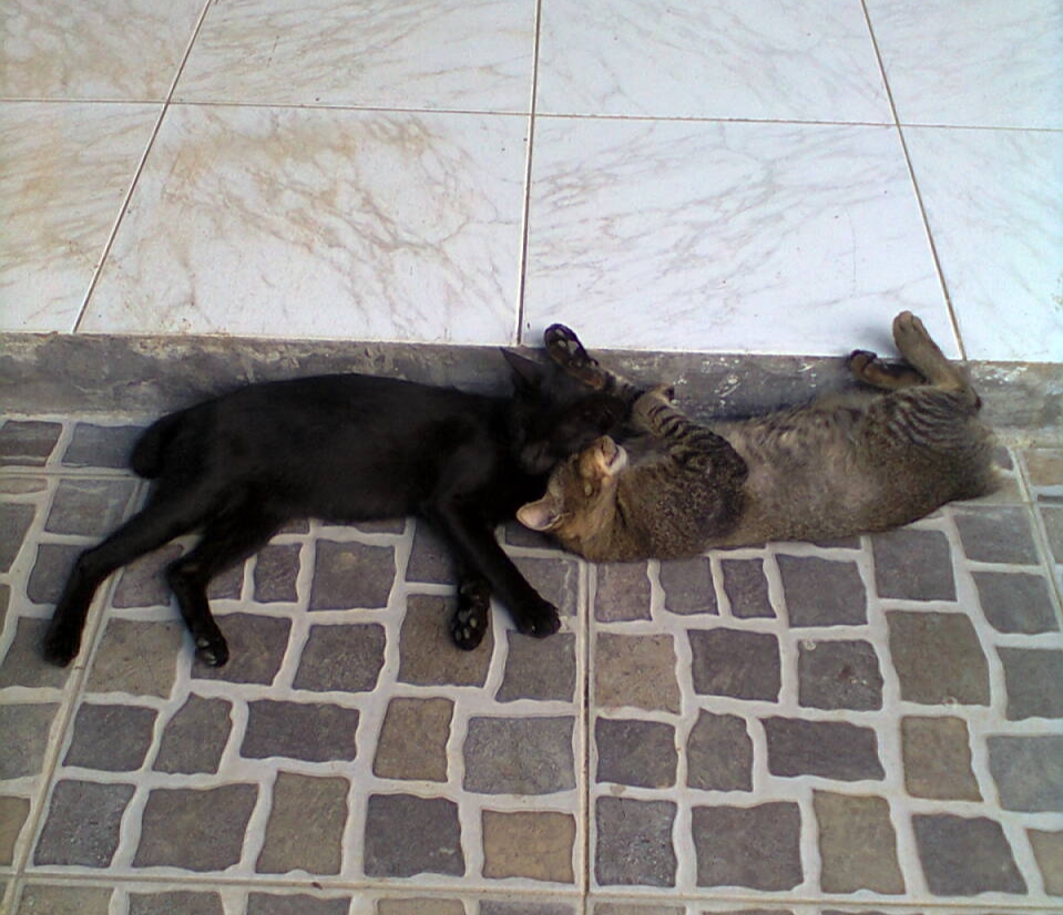 yang dibuang oleh pemiliknya, inilah dua ekor kucing yang bertingkah baik dan tidak suka mencuri ikan2 pemilik rumah. Sehingga dimanapun ia bebas beristirat tanpa rasa takut akan dipukul dan diusir akibat dari kenakalannya. Kedua ekor kucing tersebut walaupun berbeda dari segi warnanya namun bila sedang ingin tidur bersama tingkahnya sangat menggemaskan bagibsetiap yang melihatnya. Seolah-olah bagaikan sedang manusia yang sedang kasmaran.