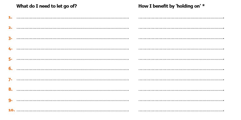 While you may not wish to do anything about these right now, just listing what you need to let go of here will raise your level of awareness and you’ll naturally begin to loosen your grip. So, simply list below what you’re holding onto, what slows you down, what riles you up and anything that gets in the way of you being the best you can be…