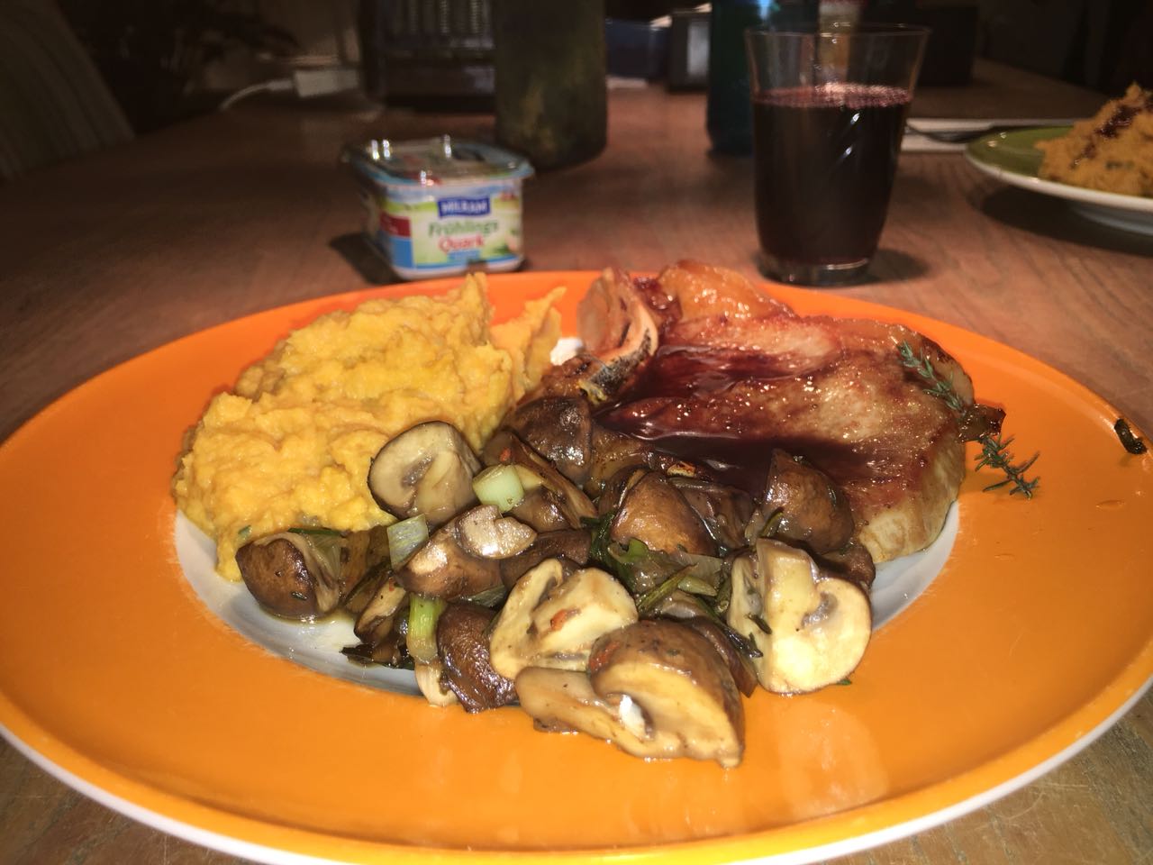 After the training I quickly went showering, shopping and went to a good friend to prepare a really hot dinner together. We opted for cutlet with a wine sauce, mashed potatoes and Jerusalem artichoke, with mushrooms, onions, leek and some fresh herbs. Incredibly delicious, especially the puree was great!