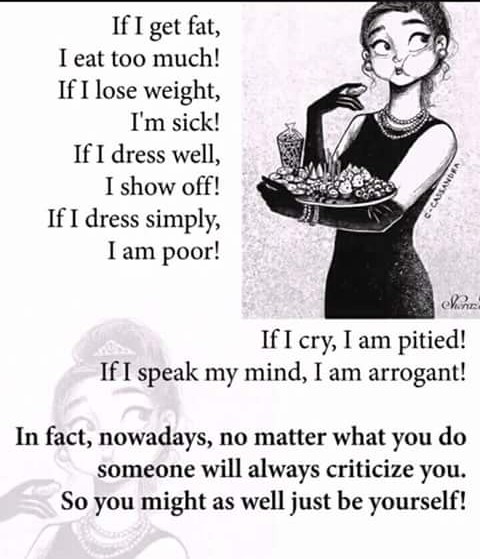 Be yourself, keep your head high, stand tall; all this isn't been arrogant or proud is knowing who you are and refusing to act less. Stop trying to impress people who will still end up finding fault in all you do.