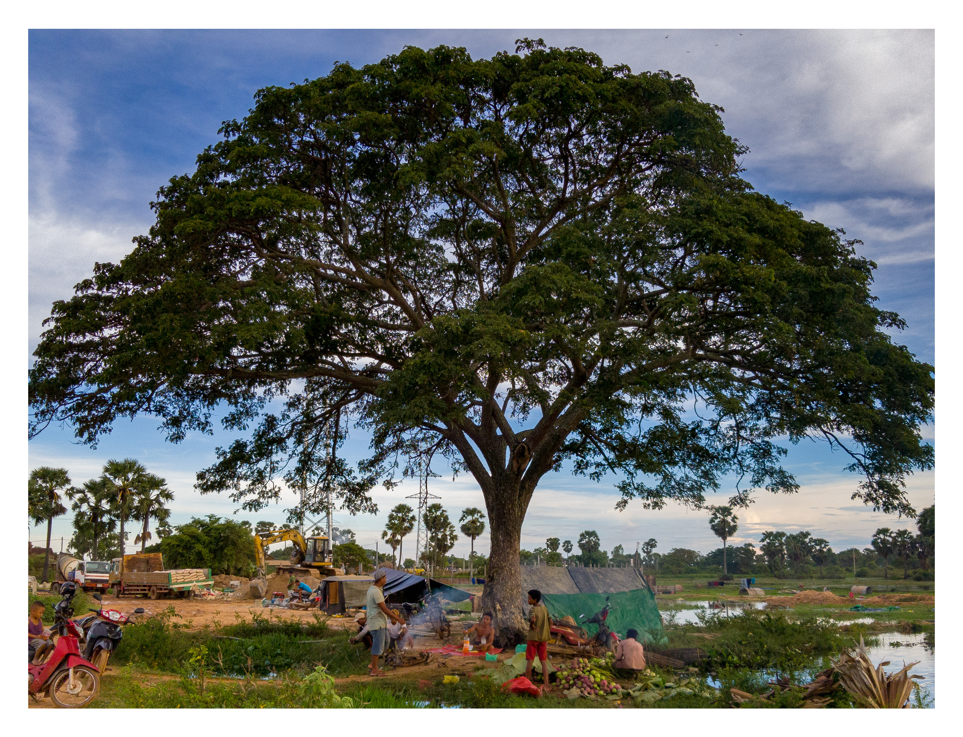 We couldn't believe that this beautiful tree had been cut down, probably it had to make space for the high voltage line that had been built above it. The last time we were here there was a bunch of friendly locals drinking Khmer wine, and even we got to try some. They were also bringing boat after boat full with lotus flowers which we couldn't figure out what they where going to do with them, but one of the boys did gave one to my friend as a gift.