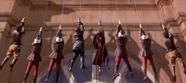 This is actually a pretty cool scene, with all the droids deploying at the same time and stuff. Too bad it's already been well-established that the battle droids are silly, easily-defeated clowns that make the Stormtroopers look talented and dangerous.