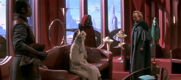 Anyway, Palpatine spouts out some bullshit about how Chancellor Valorum is a corrupt loser who can't lead the senate to get anything done, so although Amidala is slated to speak to the congress he doesn't expect anything to come of it, and perhaps they can make a move in this moment of weakness.