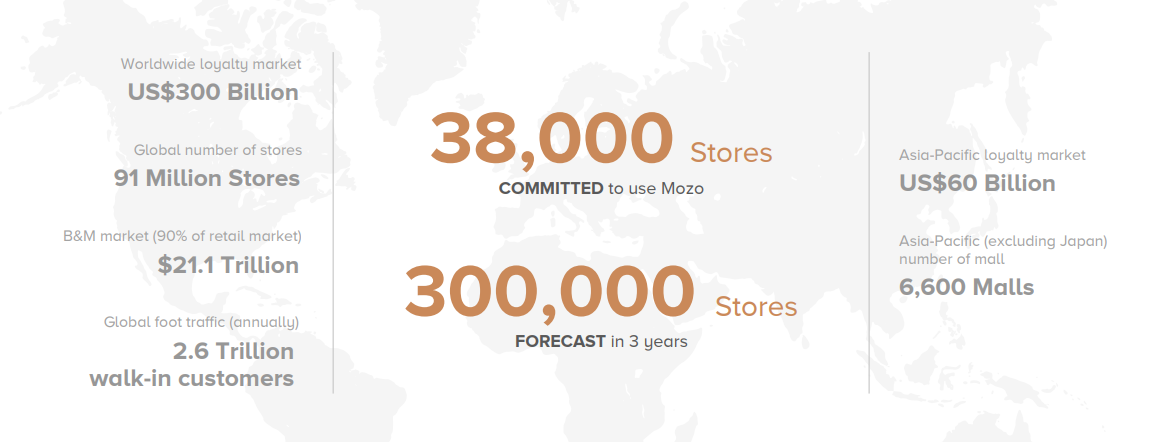 Mozo adalah masa depan industri ritel. Dengan teknologi yang sudah terbukti, teknologi ini seharusnya tidak mengejutkan, kami sudah memiliki 38.000 tempat yang berkomitmen untuk menerapkan Mozo. Kami memproyeksikan jumlah ini untuk tumbuh menjadi 300.000 selama tiga tahun ke depan. Mal besar hanyalah salah satu dari banyak tempat yang dapat memanfaatkan Mozo. Hotel, restoran, stadion, ruang acara, resor, dan papan pariwisata adalah beberapa aplikasi jelas lainnya yang dapat memanfaatkan penggunaan token Mozo. Siapa pun yang ingin mengontrol dan meningkatkan lalu lintas pejalan kaki dapat memperoleh manfaat dari Mozo.