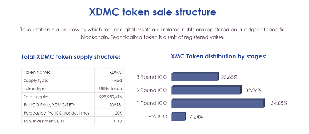The supply of XDMC tokens will be controlled by consuming a portion of the purchased back tokens and limiting the offer of the rest of the tokens to three months. XDMC holders will vigorously profit by the buyback program. Those wishing to purchase the tokens can do as such amid the ICO or on the different trades instantly after the main ICO.