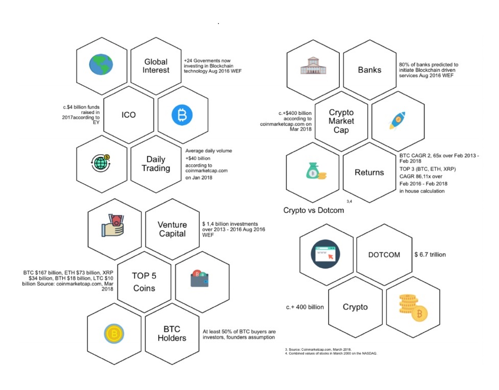 The capitalisation of crypto markets currently stands at c. $400 billion. An additional $200 billion of assets may benefit from a comprehensive digital wealth management solutions as aresult of a problems in the traditional asset and wealth management industries. This means that the total market opportunity is c. $600 billion, and this market is still growing exponentially.