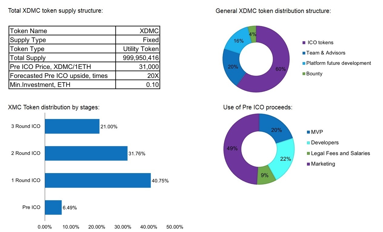 Pre ICO Dates: 07.05.2018 – 17.06.2018, During Pre ICO round XDMC tokens will be available on the Waves Platform. All Waves based tokens will be replaced with 1:1 Ratio before the 1st ICO round into the Ethereum based XDMC Token.
