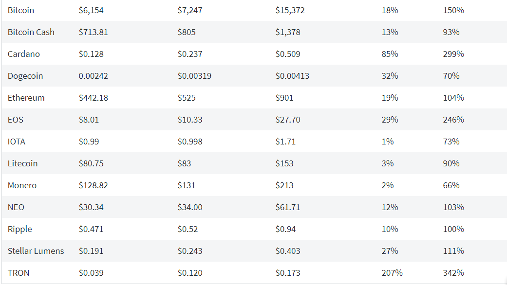 De las 13 monedas, nuestros panelistas pronostican que TRON experimentará el mayor crecimiento de precio tanto para este mes (207%) como para el 31 de diciembre de 2018 (342%). Se espera que Cardano tenga el segundo mayor aumento para el final del año (299%), seguido por EOS (246%).