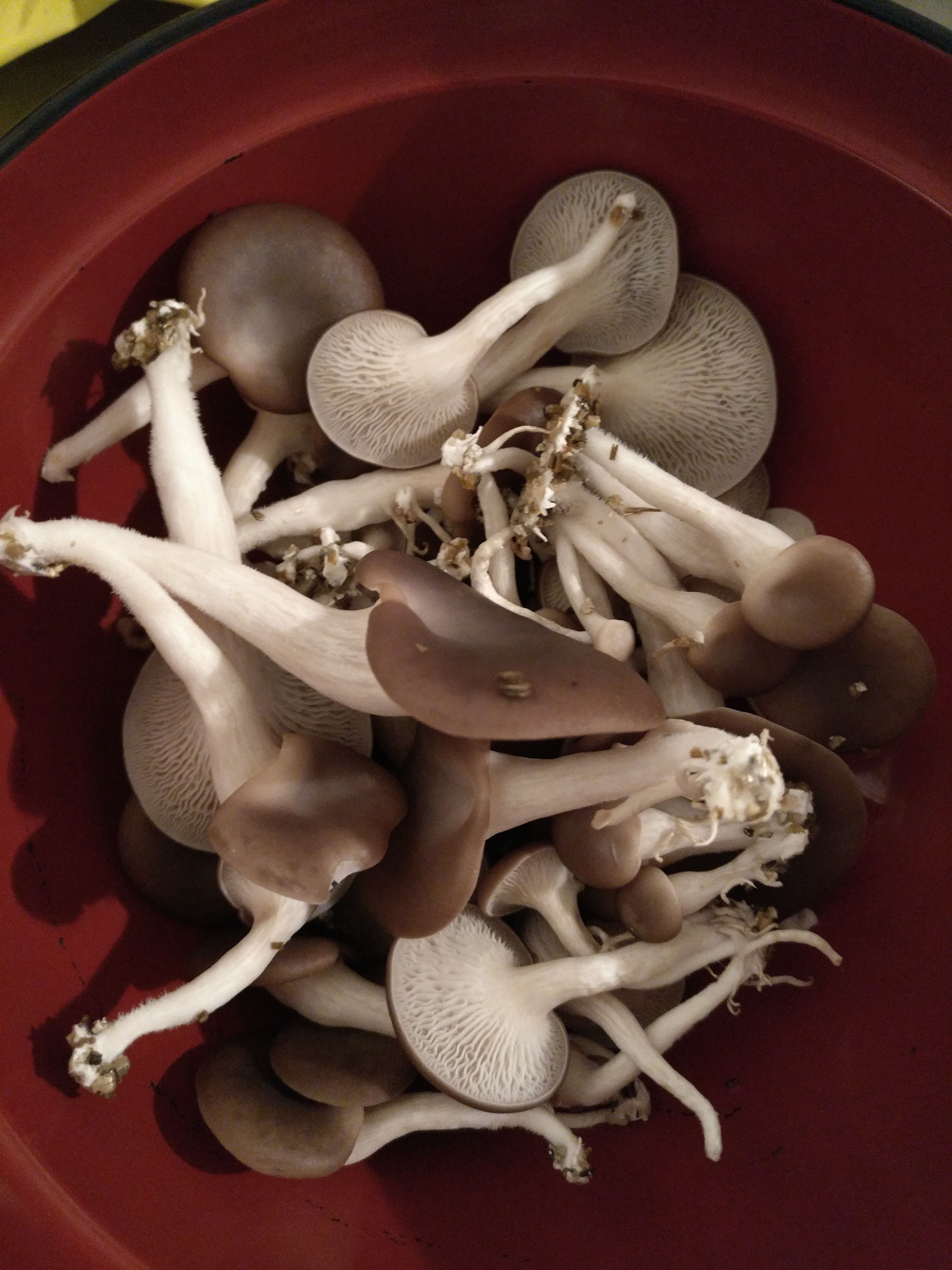 Harvest!!! Cut the ends off, some people keep them to inoculate another batch instead of buying spawns but I cant be bothered lol. Washed them and stir fried with olive, salt and garlic. Delicious!