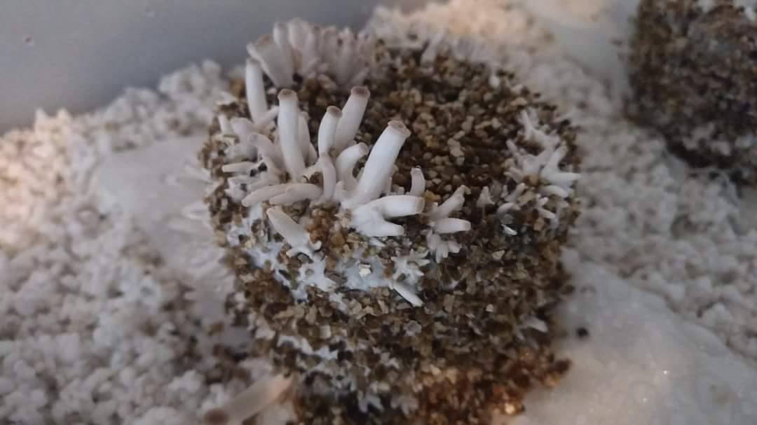 As you can see, these are the brown rice cake I made all fully colonized. I dunked them into water over night, rinsed them, add dry vermiculite all over, placed them in a humid place and sprayed water couple of times a day.