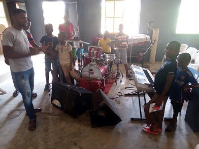 Since today is the first day of the training, we were having an introductory class to music. We talked about music, musical instruments, kinds, benefits, and how to maintain them. Also scale (major scale or diatonic scale) was introduced to them. They were taught of their sounds and symbols as in (d: r: m: f: s: l: t: d). Thereafter, the musical instrument where shown to them and most importantly, how to maintain them and the benefit of playing an instrument was taught. Some of the maintenance and benefit are: