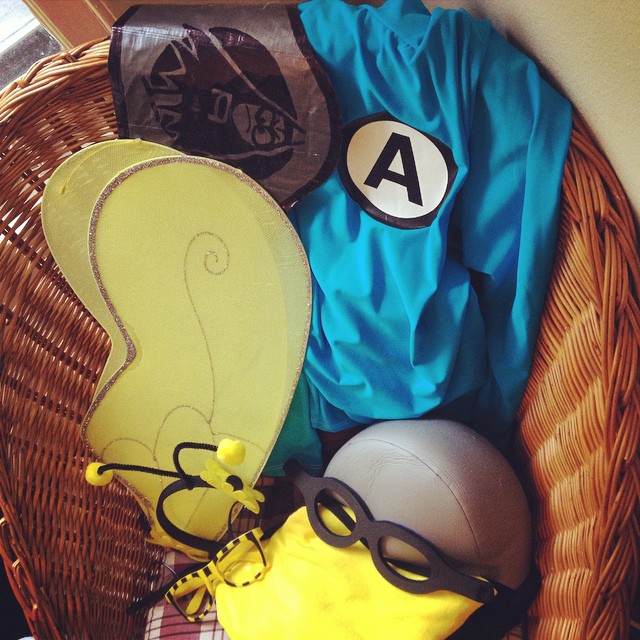 My Aquabat Uniform! I purchased the blue rashguard, anti-negativity helmet, and goggles. The power belt is homemade. Pictured alongside Evan's bee costume.