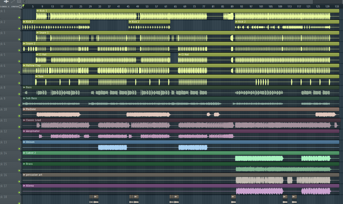 After I got this to where I liked it. I then imported the midi file into FL Studio and started building out the song and those 16 bars that are are single midi file, becomes what you see below.