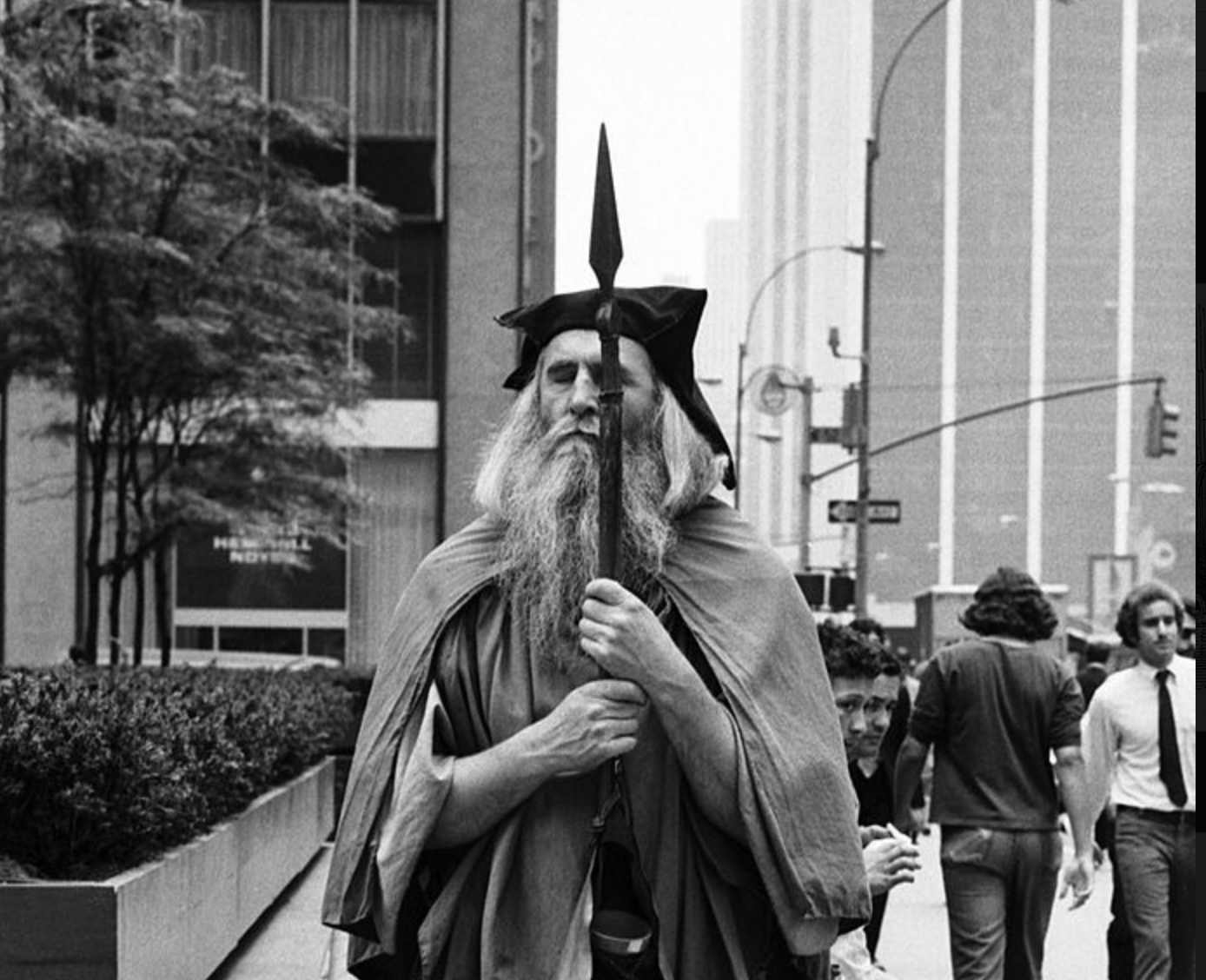 Hardin was what you could call a "panhandler by choice". He strived to be in the midst of the overwhelming concrete jungle, despite his inability to see, making friends and spreading his words. After being told many times by passer-bys and potential customers that he beared a strong resemblance to Jesus Christ, Hardin eventually had had enough. Having abandoned his Christian faith years earlier, he decided that he needed to put a stop to the comparisons. He was also extremely interested in Norse mythology and in making his own clothes, so he slowly began to develop an appearance resembling the Norse god Odin; even toting a spear.
