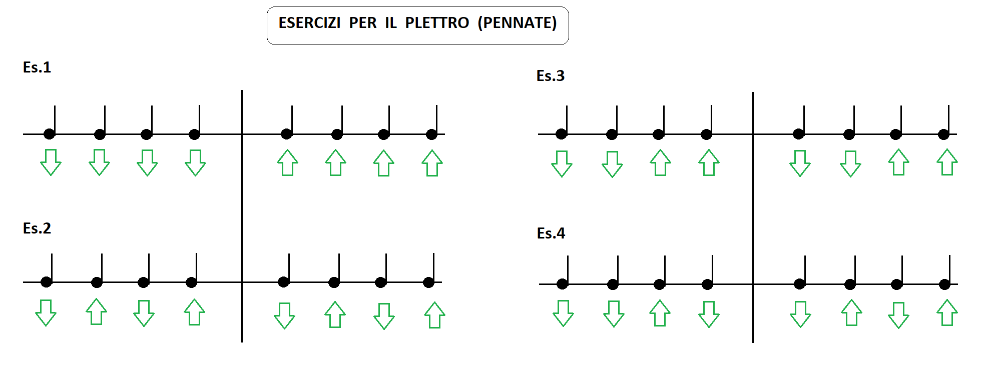 Ecco qui sotto, dei semplici esercizi per cominciare. La freccia in basso indica una pennata verso il basso, la freccia in alto una pennata verso l'alto. Eseguire l'esercizio su ogni singola corda spostandosi su tutto il manico.