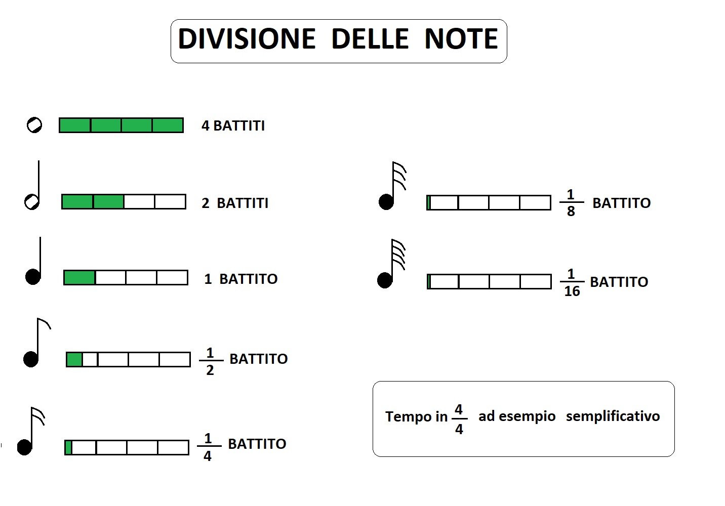 Il tempo è la sua durata nella battuta e anche qui trovate uno schema riassuntivo più sotto denominato "divisione delle note".