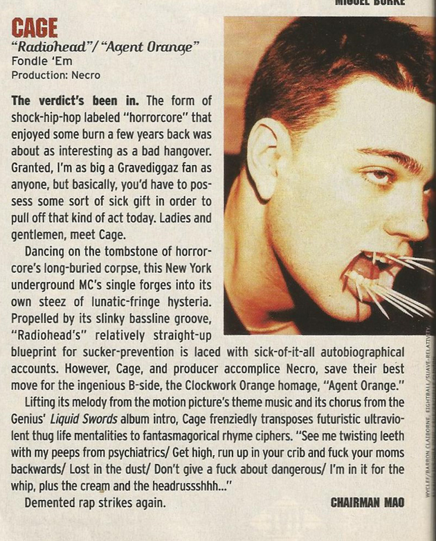Cage also had a beef with Eminem about him stealing Cages style in the end of the 90s. A lot of people can testify that Em was rapping like Nas/AZ in 1996. Cage dropped “Agent Orange” and “Radiohead” in 1997, and Em starts rapping like he’s insane in 1999. Also, Em spent some time in Jersey with The Outsidaz in the 90s, so he was probably familiar with Cage to an extent. It’s not like that’s a bad thing, though. Everyone gets their style from somewhere.