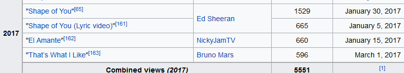 As you can see the #2 and #3 is Shape of you from Ed Sheeran. In my opinion Despacito will be #1 2017 music, due to it's lyrics and the radios, which Despacito is #1 at most country's charts.