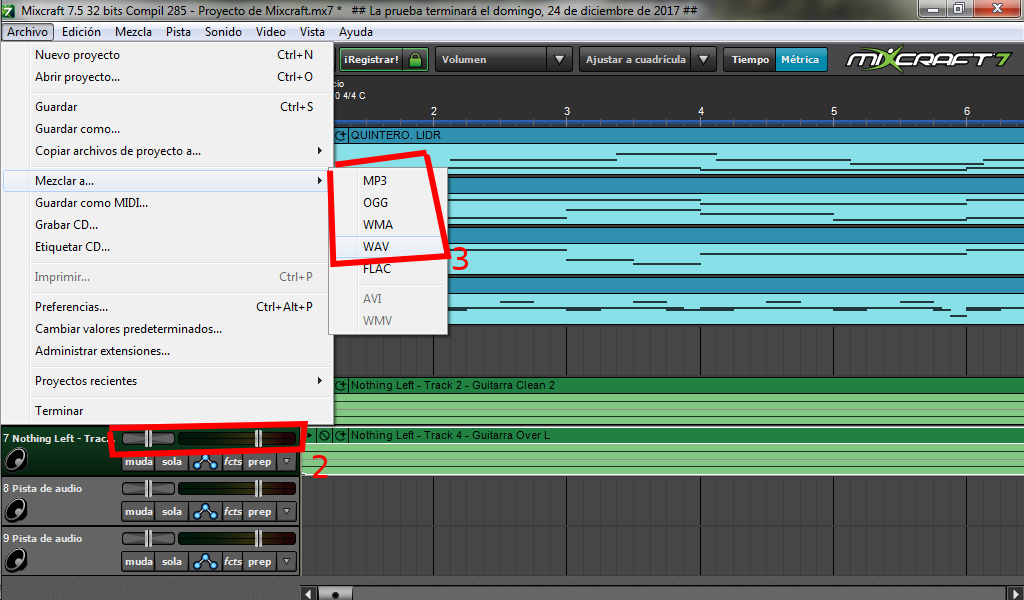 Tras haber hecho nuestra grabación solo nos queda repetir el proceso (si hay más que grabar) o si lo requiere, podemos pulir un poco algunos detalles respecto al volumen general de la grabación 2. Cuando estemos satisfechos con el resultado solo resta exportar nuestra canción, para ello desplegamos el menú y exportamos en el formato que mejor nos parezca 3.