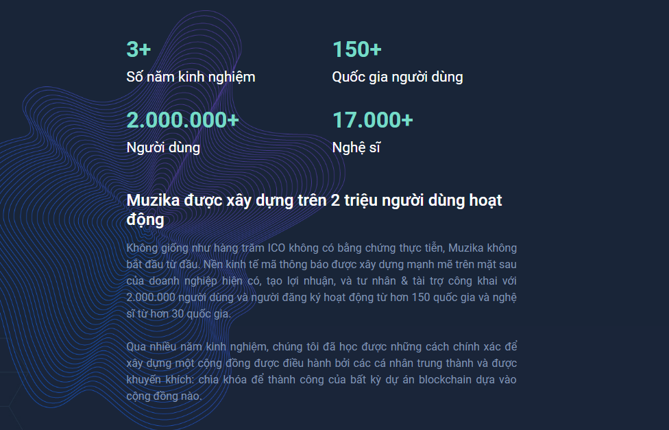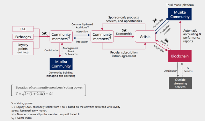 이전에 활동했던 200만명 회원이 이 권리를 누릴 수 있으며 Muzika는 기술적 파트너십을 설정했고 블랙하마,파시안과 스코어 프론시 그리고 드론 마리아 LLP와 무역 파트너관계를 맺었습니다. 그들의 현존 투자가들은 글로벌 캐피털,256Ventures 그리고 블록체인 공간에서 다른 신규들도 포함합니다.