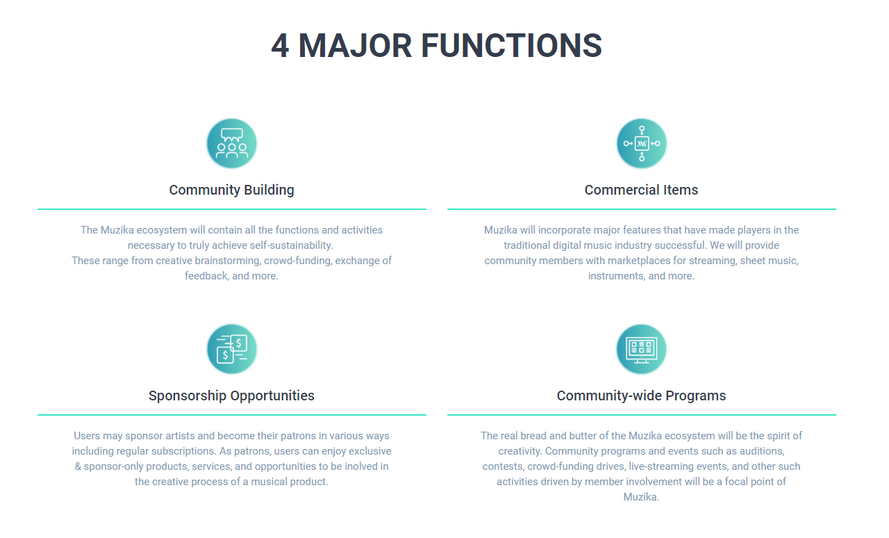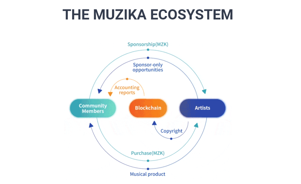 오늘날 음악산업에서 소유권,검출 및 유통에 대한 도전들은 아티스트들이 절대적인 지속 가능 경영을 설정하기 어렵게 한다. 이에 대처하기 위해서, Muzika는 콘텐츠에 새로운 자급자족을 직접적으로 연결시키는 추가적인 디지털 음악 생태계를 개발하고 있다.