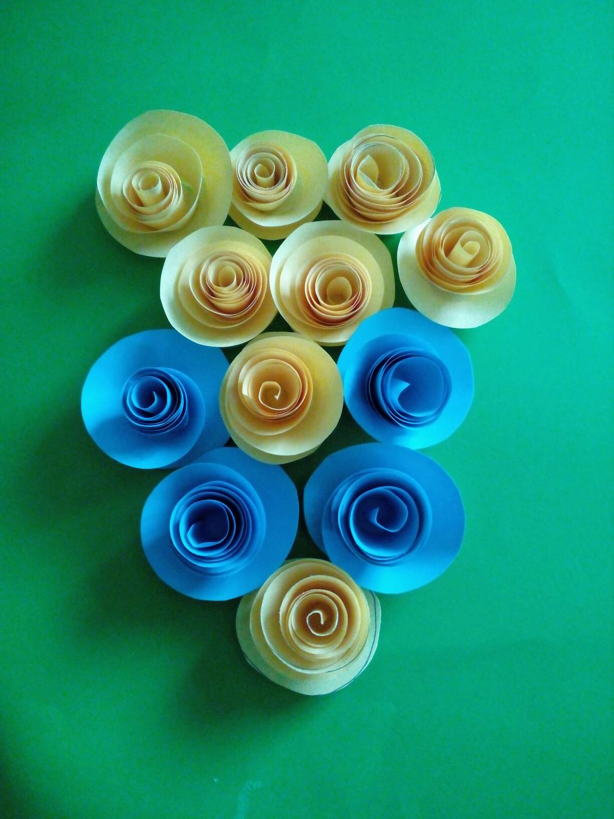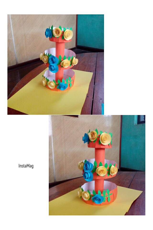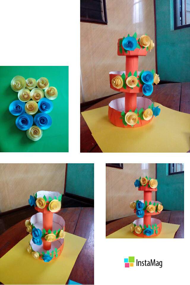 ဒီအဆင့်မှာကတ်ထူကိုလိပ်၍ခေါက်ပြီးအပြင်မှလိမ္မော်ရောင်စာရွက်ကော်ကပ်ထားတဲ့စက္ကူအလိပ်နှစ်ခုပြုလုပ်ပါတယ်။boxသုံးခုကိုထိုစက္ကူအလိပ်နှစ်ခုဖြင့်ပုံအတိုင်းကော်ကပ်ဆက်လိုက်ပါတယ်။ဆက်လက်ပြီးအစိမ်းရောင်စာရွက်ပေါ်အရွက်အခက်ပုံစံဆွဲ၍ဖြတ်ပြီး၊boxတွေပေါ်ကော်ကပ်ပါတယ်။ပြီးနောက်ပန်းပွင့်များပြုလုပ်ပါတယ်။စာရွက်ပေါ်ပုံစံအရင်ဆွဲပြီး၊ဆွဲထားတဲ့အတိုင်းဖြတ်ကာအနားတစ်ဘက်မှအတွင်းသို့ခေါက်၍အဆုံးမှာကော်ကပ်ပါတယ်။အပြာနဲ့အဝါရောင်နှင်းဆီပွင့်များပြုလုပ်ပြီးကော်ကပ်အလှဆင်ပါတယ်။