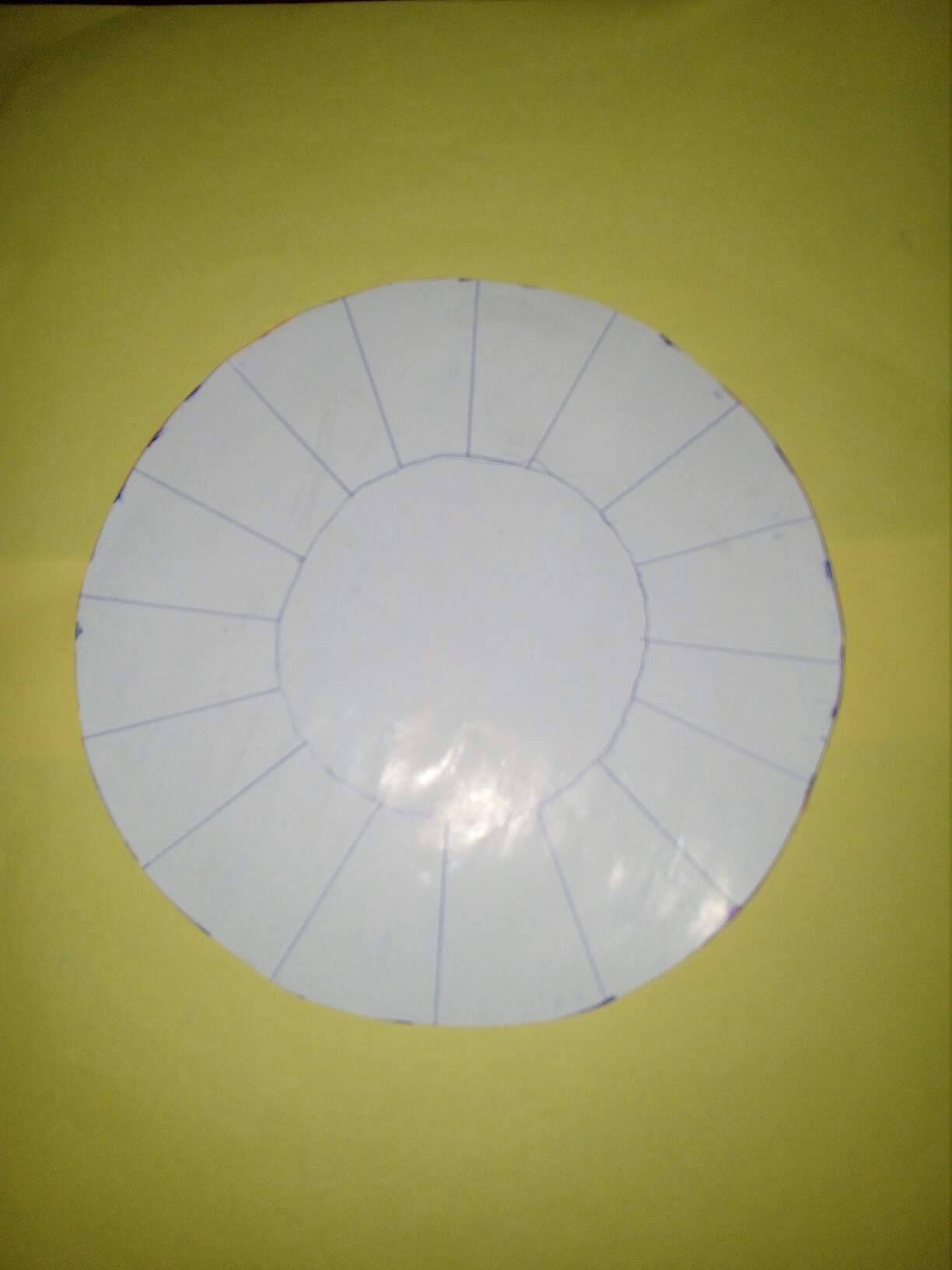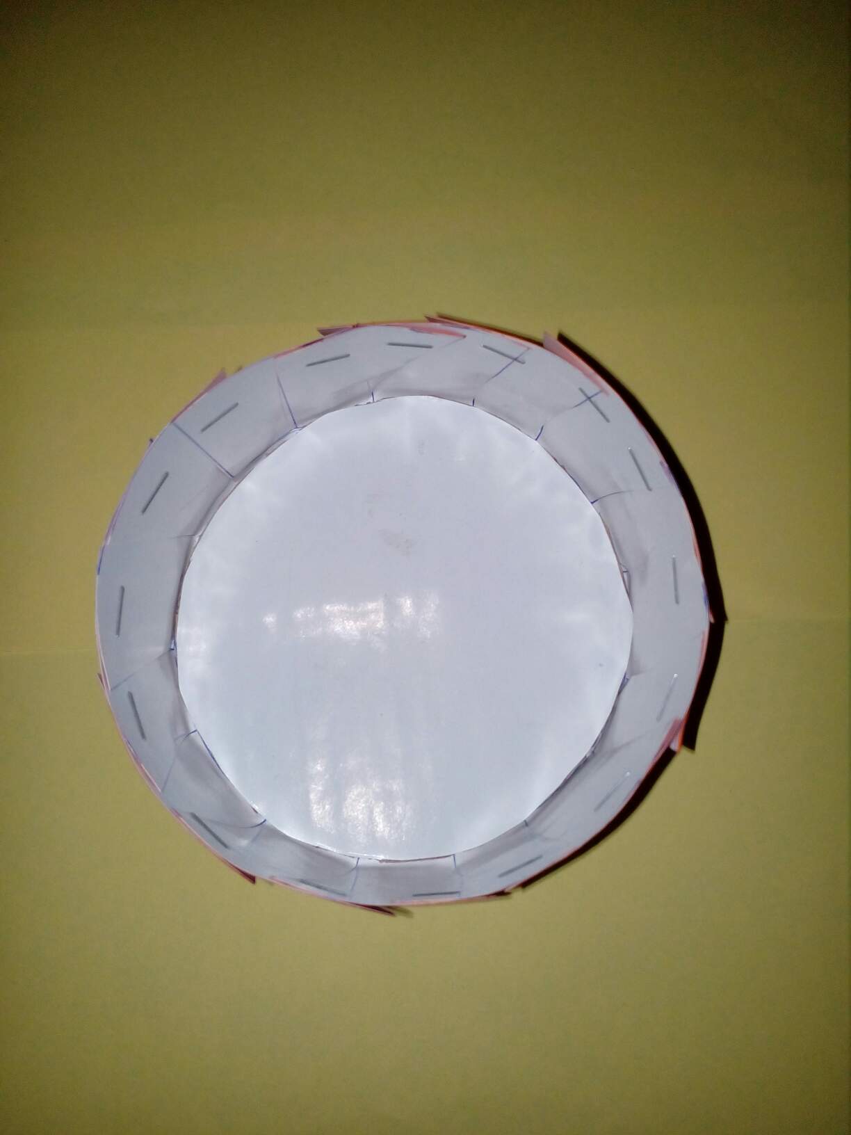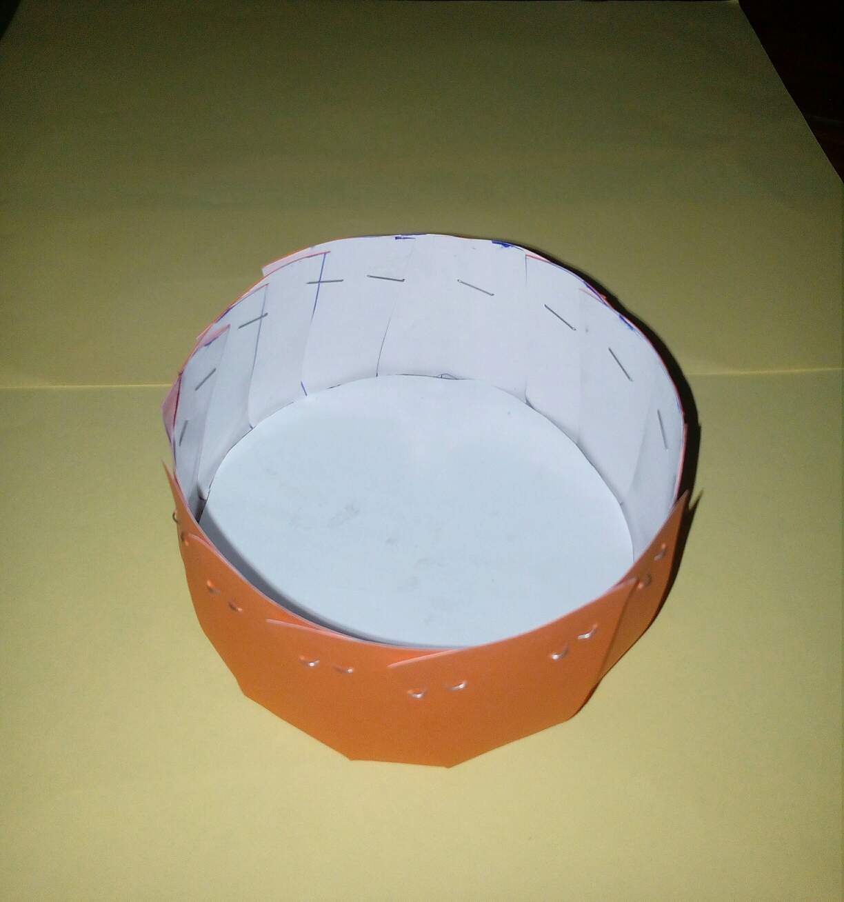 ပထမအဆင့်မှာတော့အရွယ်မတူတဲ့boxသုံးခုပြုလုပ်ပါတယ်။ကိုယ်ပြုလုပ်ချင်တဲ့အတိုင်းအတာကိုကတ်ထူနှင့်လိမ္မော်ရောင်စာရွက်တစ်ဘက်စီကပ်ထားတဲ့စာရွက်ပေါ်စက်ဝိုင်းပုံဆွဲလိုက်ပါတယ်။boxရဲ့ဘေးဘက်တွေမှာ၂လက်မအကွာအဝေးဖြင့်အခြားစက်ဝိုင်းတစ်ခုထပ်ဆွဲပါတယ်။အပြင်ဘက်စက်ဝိုင်းမှာအပိုင်းငယ်များဆွဲ၍ဖြတ်လိုက်တယ်။အလယ်စက်ဝိုင်းမှာထားရန်အခြားကတ်ထူတစ်ခုကိုတိုင်း၍ဖြတ်ပြီးအဖြူရောင်စာရွက်ကော်ကပ်ပါတယ်။ထိုကတ်ထူကိုအလယ်နေရာမှာထားပြီး၊ဘေးဘက်မှစက္ကူအပိုင်းများကိုခေါက်တင်၍တစ်ခုနဲ့တစ်ခုကိုကလစ်ဖြင့်ညှပ်ပြီးဆက်လိုက်ပါတယ်။ထိုနည်းအတိုင်းboxသုံးခုပြုလုပ်ပါတယ်။