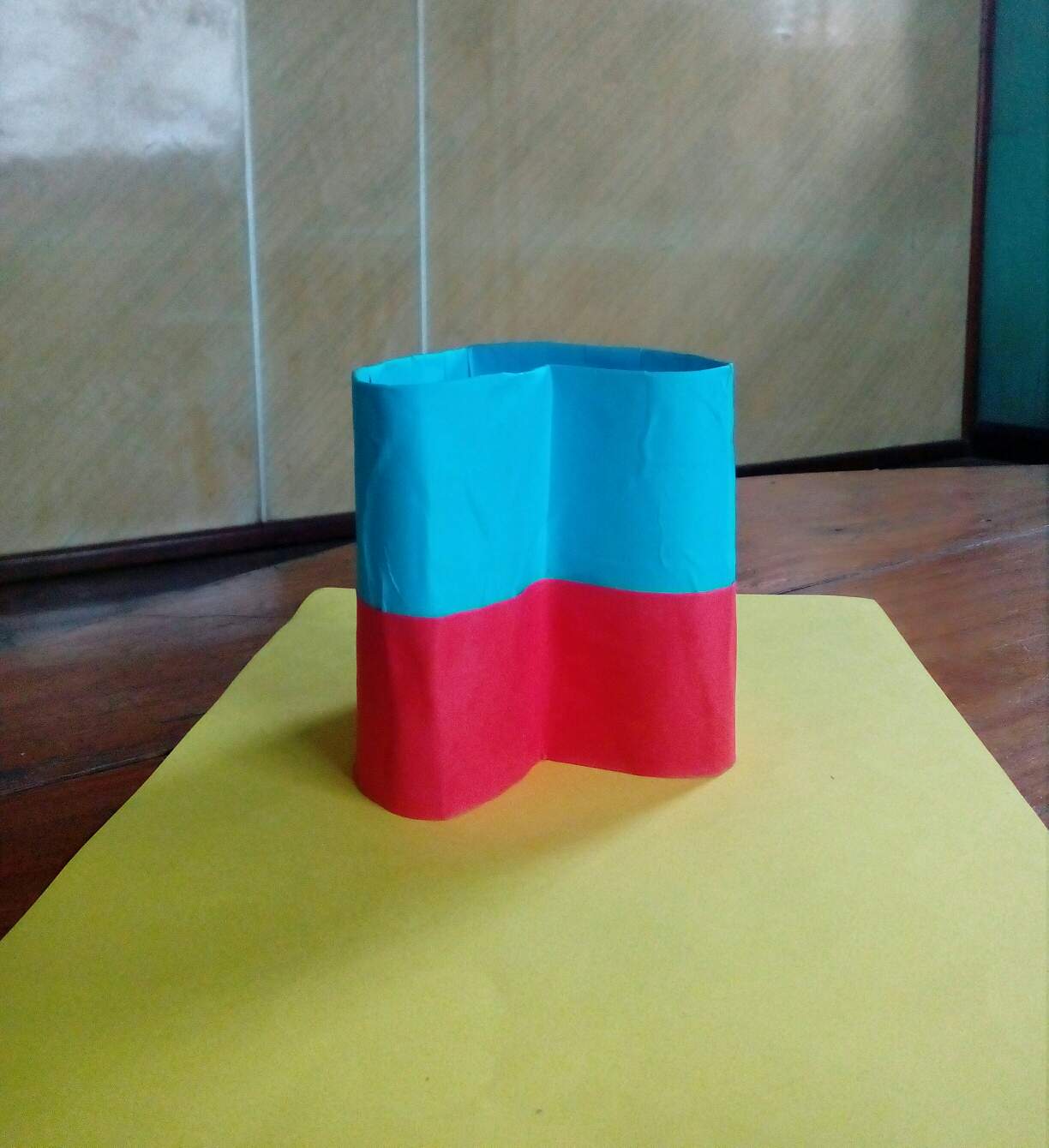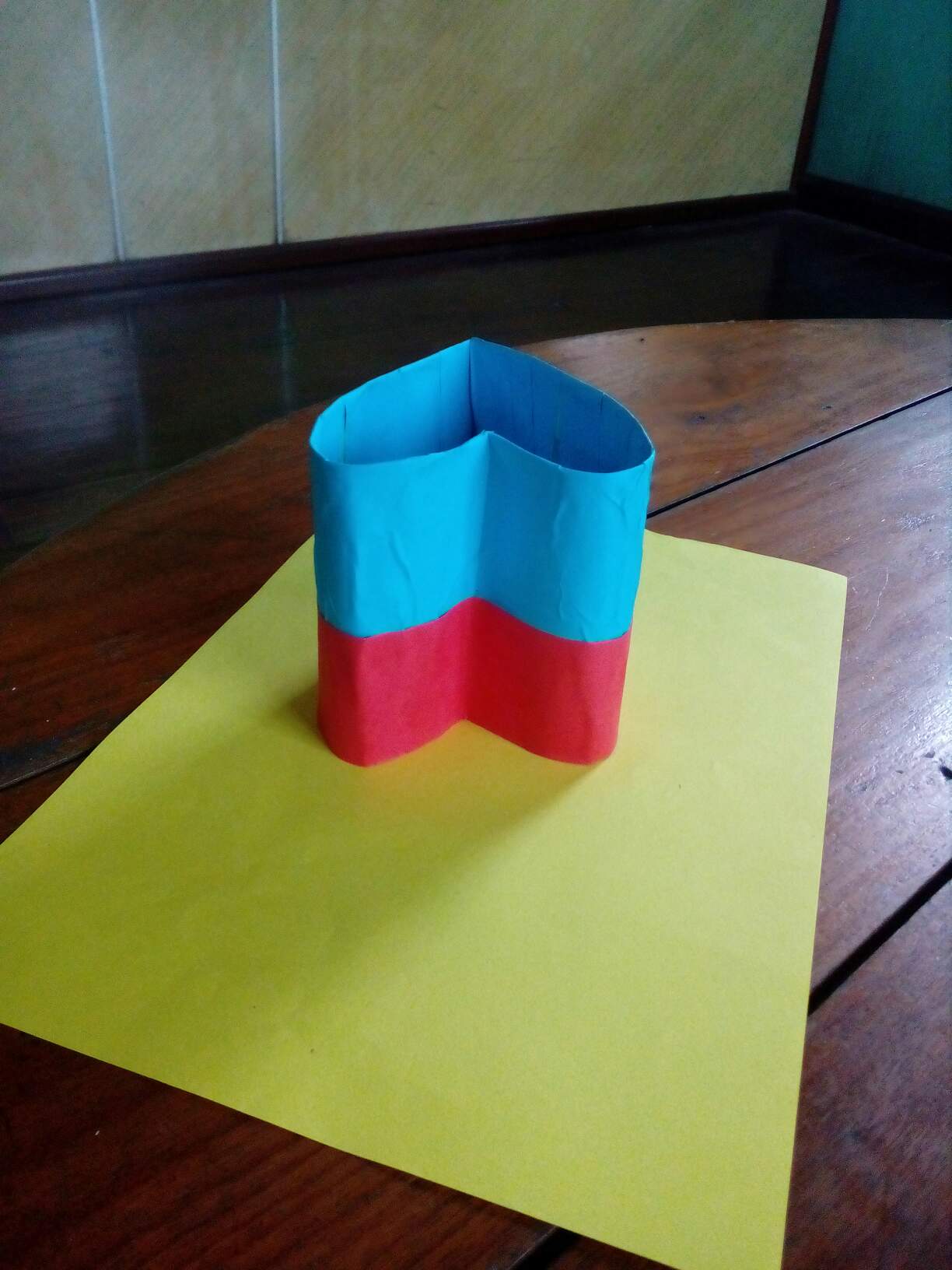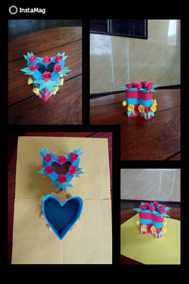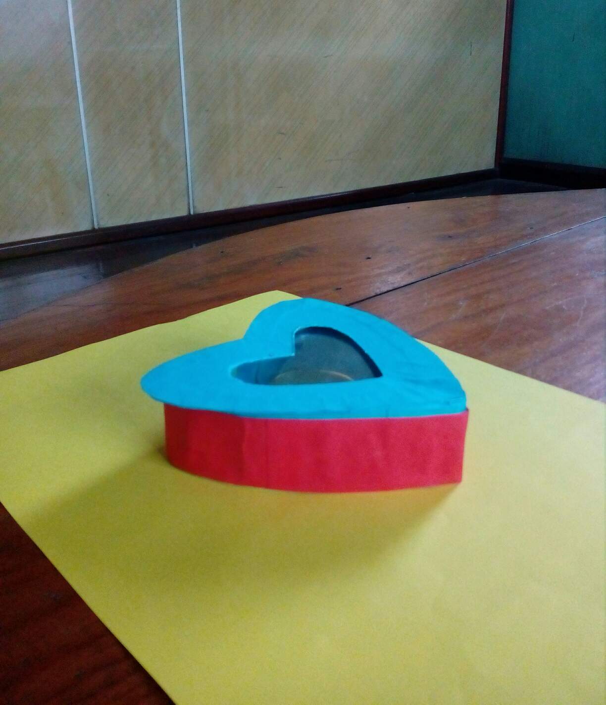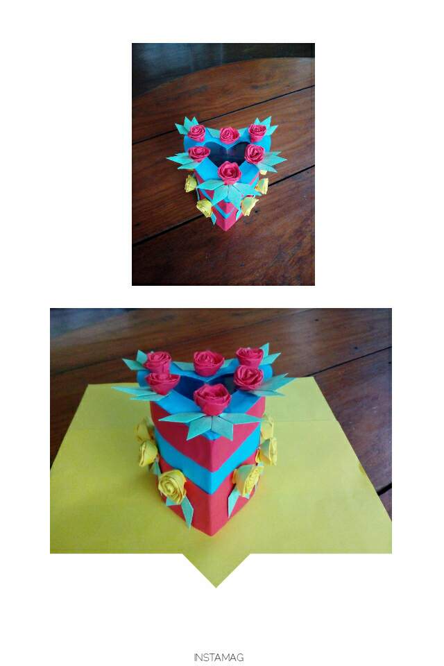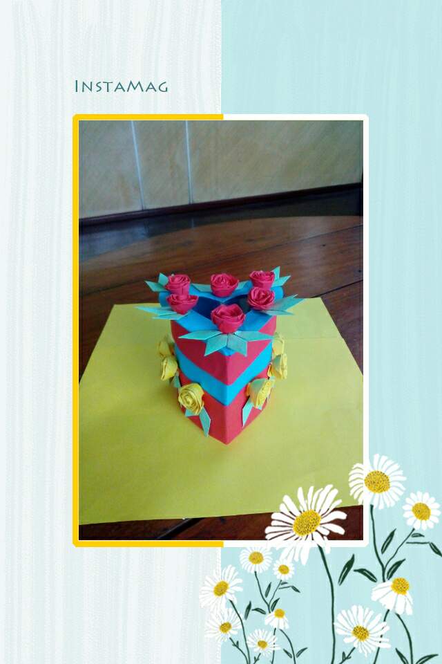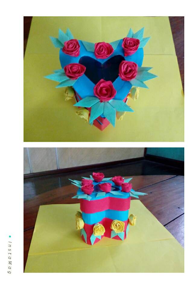 ဒီတစ်ခုကတော့အသည်းပုံဘူးလေးတစ်ခုပါ။ကတ်ထူကိုအသည်းပုံစံခေါက်ချိုး၍ကော်ကပ်ပြီး၊အနီရောင်နှင့်အပြာရောင်တစ်ဝက်စီကော်ကပ်ထားပါတယ်။ဘူးခွံရဲ့တစ်ဘက်ကိုလည်းကတ်ထူဖြင့်ပိတ်လိုက်ပါတယ်။ဘူးအဖုံးကိုတော့ဘူးခွံပြုလုပ်တဲ့အတိုင်းကတ်ထူကိုအသည်းပုံစံခေါက်မယ်။ပြီးနောက်အပြာရောင်စာရွက်ကော်ကပ်ပါတယ်။အဖုံးရဲ့အပေါ်ဘက်မျက်နှာမှာကတ်ထူကိုအပြည့်မပိတ်ဘဲအလယ်မှာအသည်းပုံဖြတ်၍အတွင်းဘက်ကပလတ်စတစ်အကြည်ဖြင့်ပိတ်လိုက်ပါတယ်။ပြုလုပ်ရန်လိုအပ်တဲ့ပစ္စည်းတွေကရောင်စုံစာရွက်၊ကတ်ထူ၊ကတ်ကြေး၊ကော်ဘူး၊ခဲတံ၊ပေတံ၊စသဖြင့်လိုအပ်ပါတယ်။