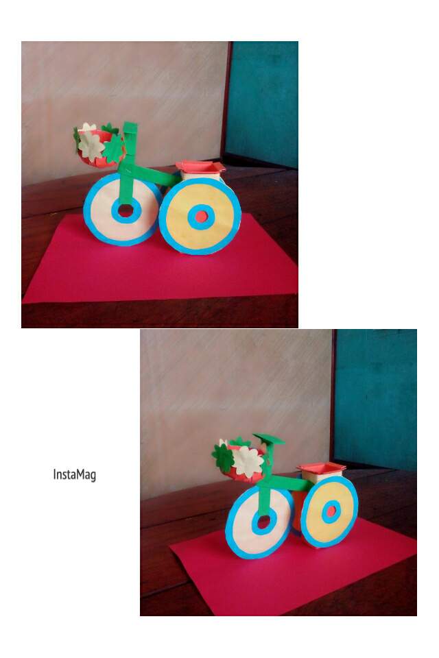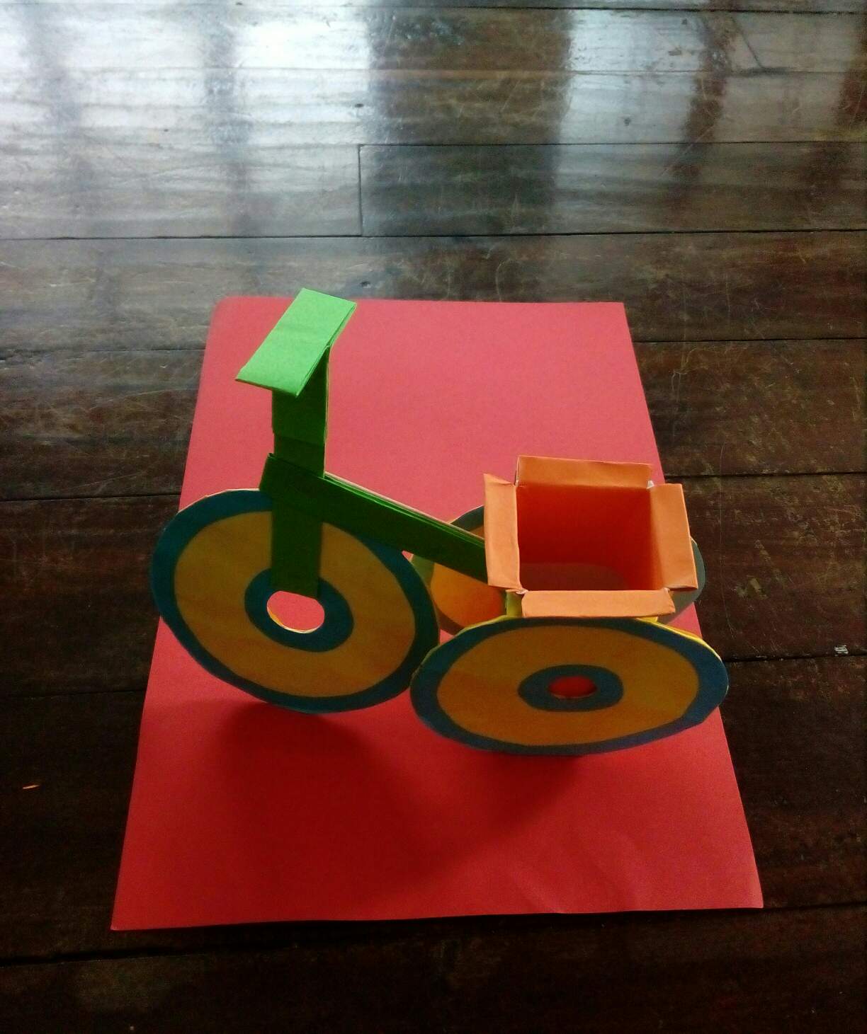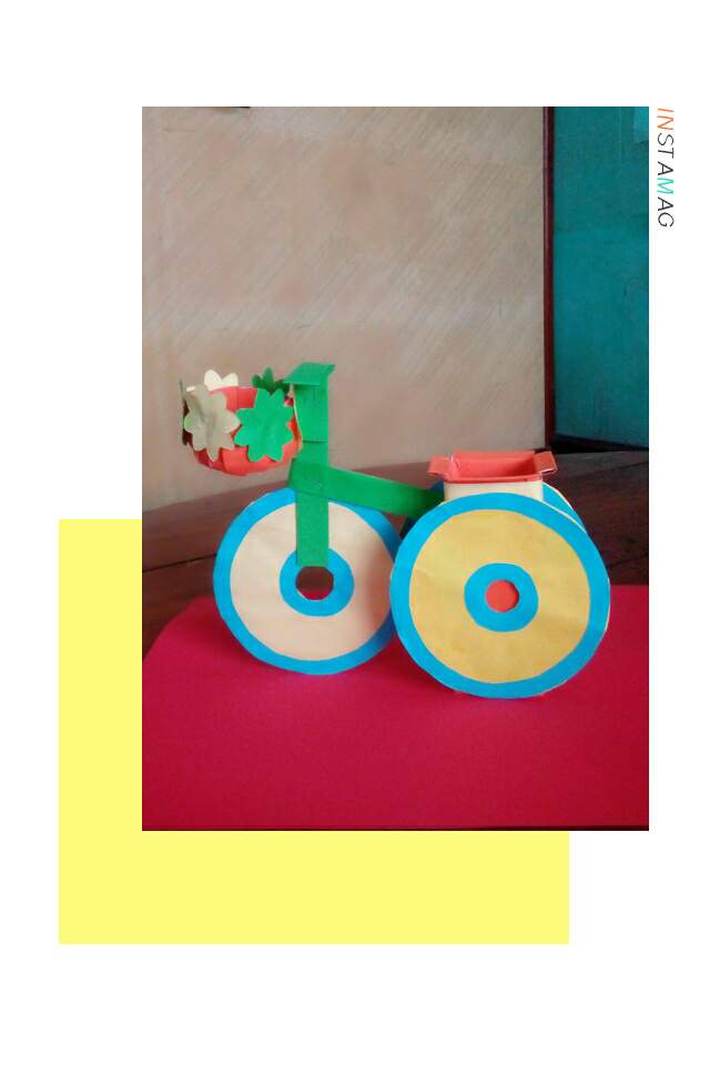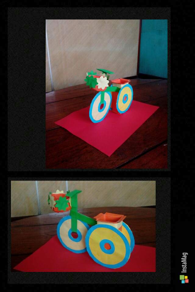 ဒီတစ်ခုကတော့pencil boxပါ။စက်ဘီးပုံစံလိုဘီးသုံးဘီးနဲ့ဘောက်စ်တစ်ခု၊ရှေ့ဘက်မှာပန်းခြင်းတစ်ခုဖြင့်ပုံဖော်ထားပါတယ်။ပြုလုပ်နည်းကိုပုံစာတို့ဖြင့်ဖော်ပြထားပါတယ်။လိုအပ်တဲ့ပစ္စည်းတွေကကတ်ထူ၊စာရွက်၊ကတ်ကြေး၊ကော်၊ခဲတံ၊ပေတံလိုအပ်ပါတယ်။အဆင့်၁မှာအရွယ်တူဘီးသုံးဘီးကိုကတ်ထူဖြင့်ပုံအတိုင်းဖြတ်လိုက်ပါတယ်။အဝါရောင်စာရွက်ဖြင့်ကော်ကပ်ပြီးအနားတွေမှာအပြာရောင်လေးတွေအနားကွပ်လိုက်ပါတယ်။ပြီးနောက်ဘူးခွံတစ်ခုရှာပြီးလိုအပ်သလိုဖြတ်၍လိမ္မော်ရောင်စာရွက်ကော်ကပ်ပါတယ်။ဘူးခွံရဲ့ထောင့်လေးခုကိုကတ်ကြေးဖြင့်ဖြတ်ပြီးပုံအတိုင်းခေါက်လိုက်ပါတယ်။ထို့နောက်ဘီးနှစ်ခုနှင့်ဆက်၍ကော်ကပ်ပါတယ်။