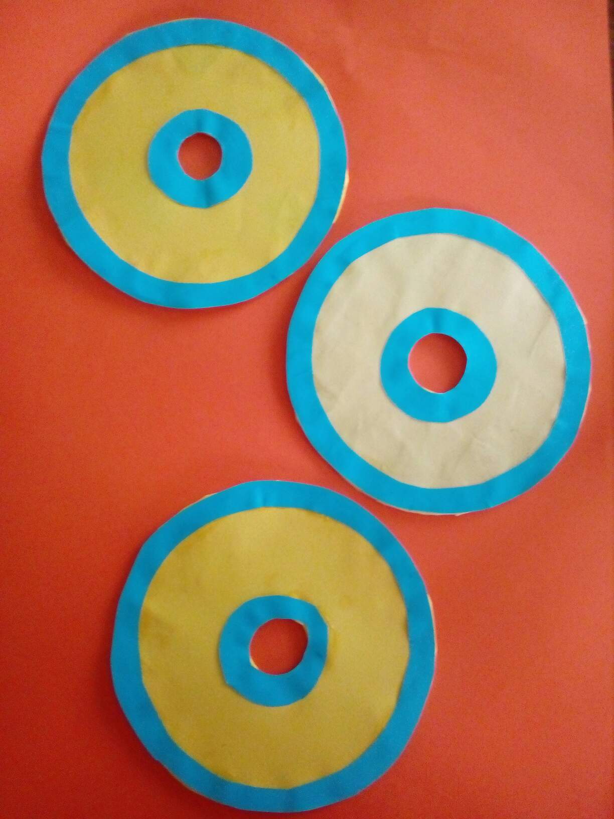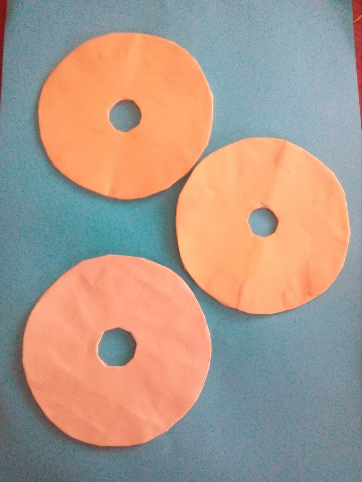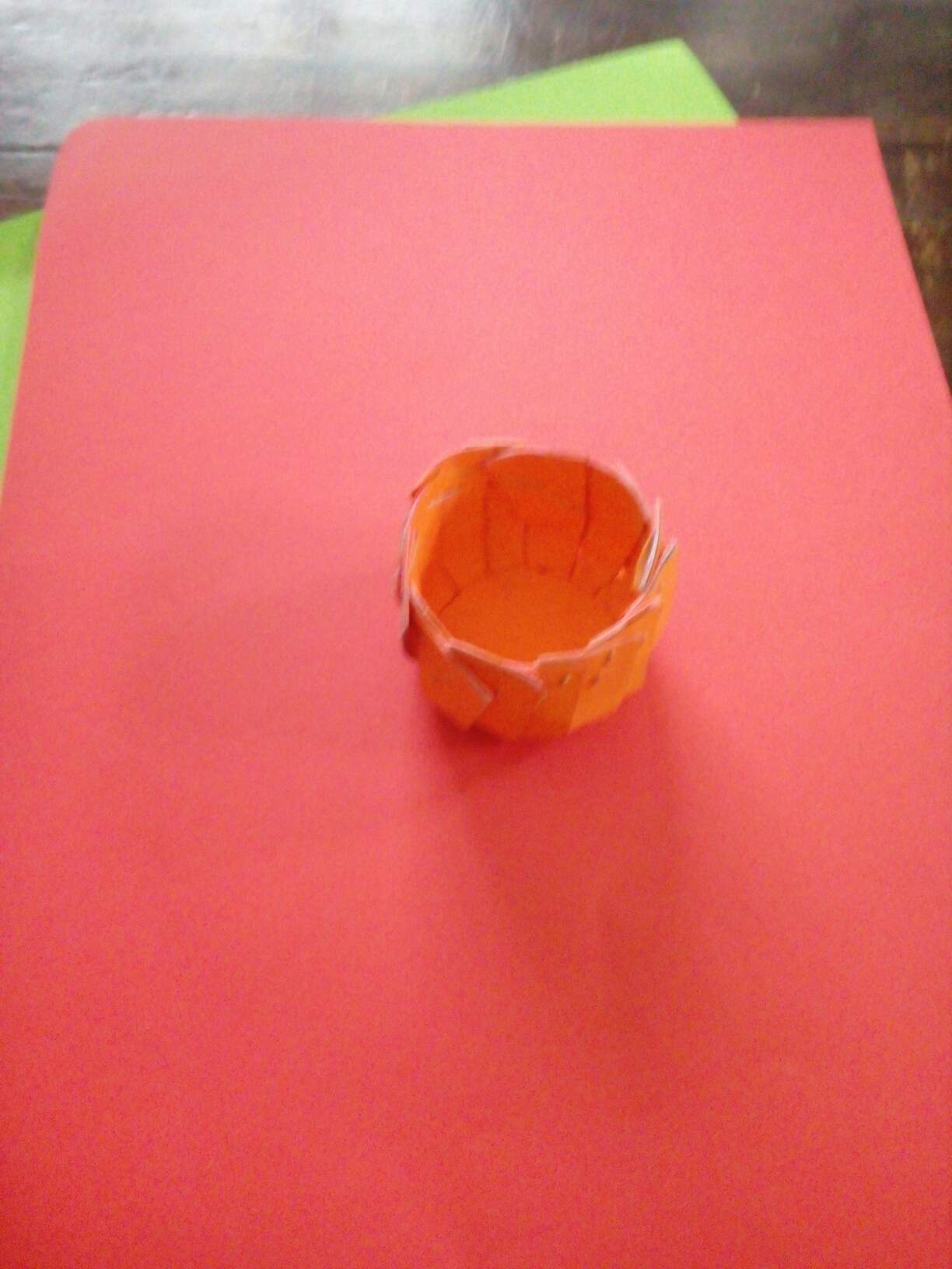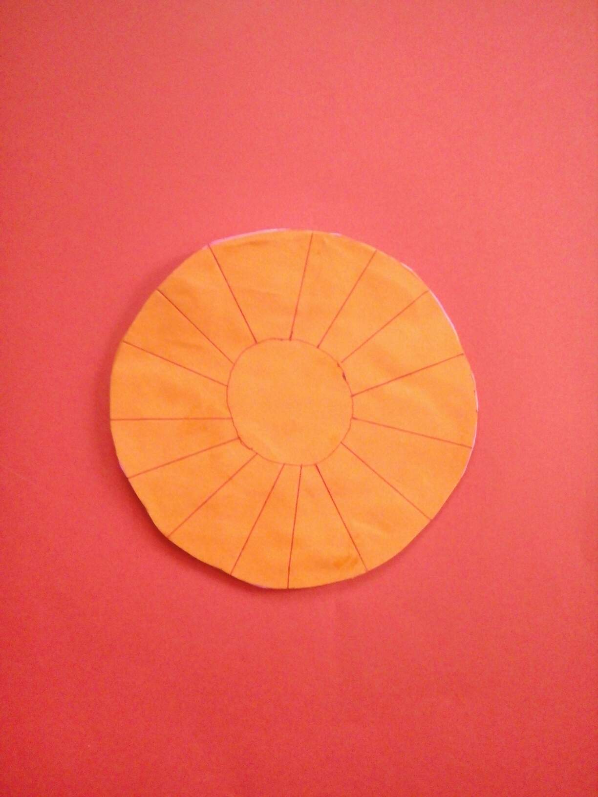 ဒီတစ်ခုကိုလည်းရှေ့ဘက်မှာထားဖို့ခြင်းတစ်ခုပြုလုပ်မှာပါ။ကတ်ထူနဲ့လိမ္မော်ရောင်စာရွက်ကိုစက်ဝိုင်းပုံဖြတ်ပြီးအလယ်မှာစက်ဝိုင်းပုံအသေးထပ်မံဆွဲပြီး၊ထိုအထိအပိုင်းငယ်များဖြတ်ရန်ဆွဲလိုက်ပါတယ်။ပြီးနောက်အပိုင်းငယ်များဖြတ်၍ခေါက်ပြီးကလစ်ဖြင့်ညပ်ကာခြင်းပုံစံတစ်ခုပြုလုပ်လိုက်ပါတယ်။အရွယ်တူပန်းပွင့်များဖြတ်ပြီးကော်ကပ်လိုက်ပါတယ်။ခြင်းကိုလည်းရှေ့ဘီးပေါ်တင်၍ကော်ကပ်လိုက်ပါတယ်။