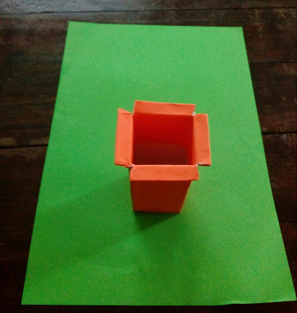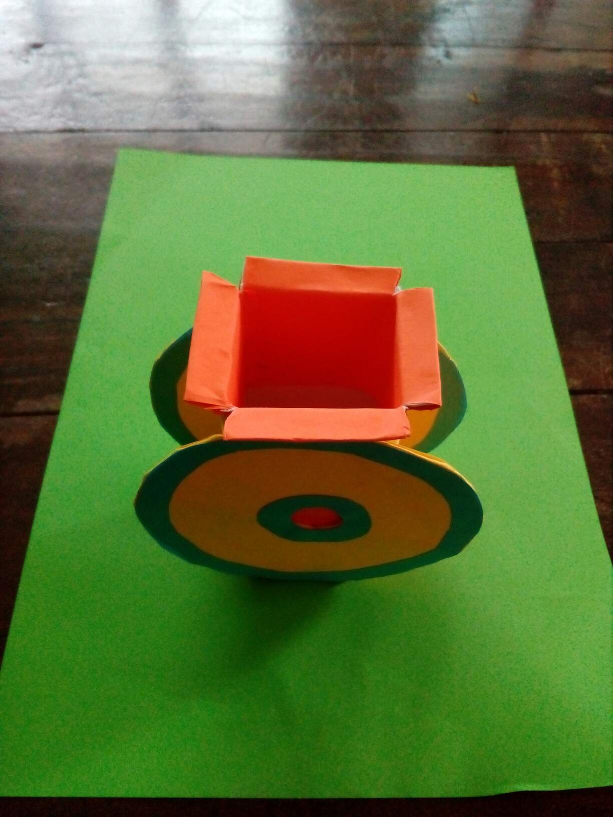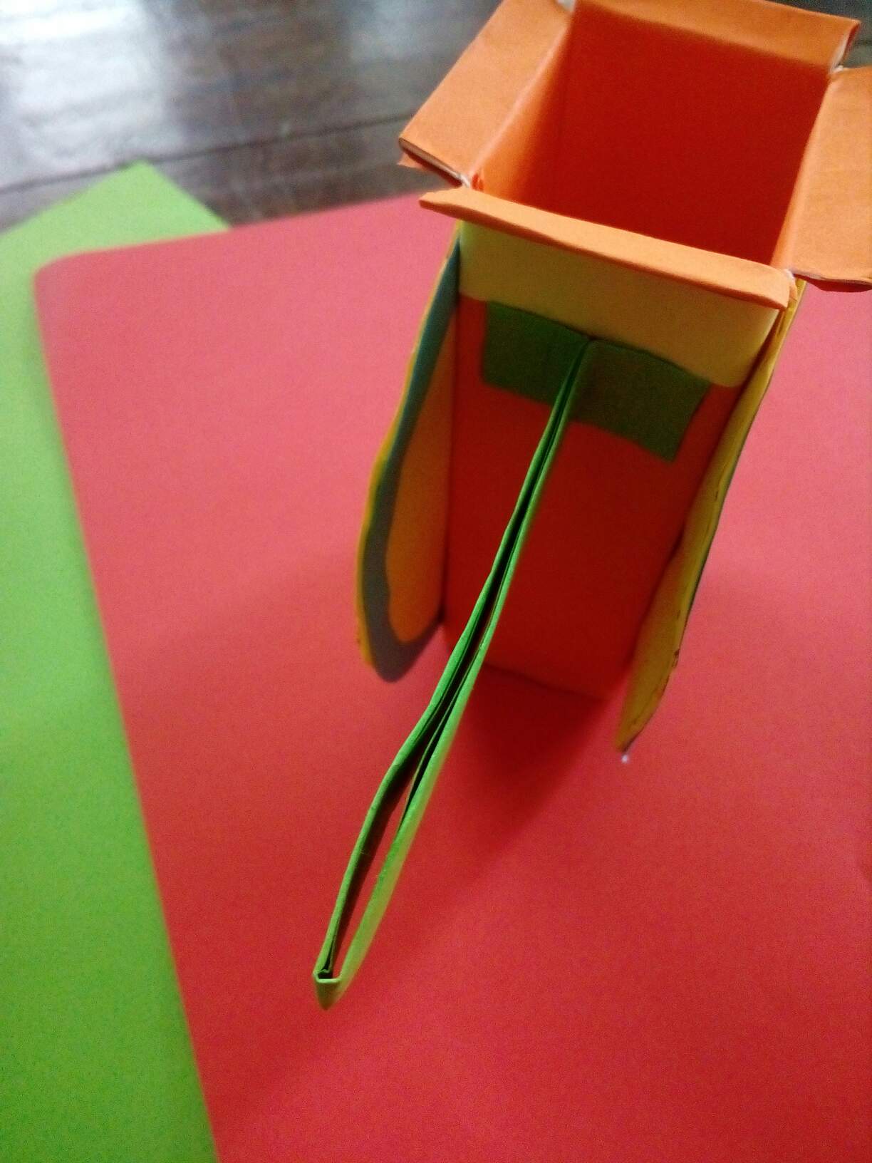 ဒီအဆင့်မှာအစိမ်းရောင်စာရွက်နဲ့ကတ်ထူကိုကော်ကပ်၍အပိုင်းငယ်ပြုလုပ်ပြီးအလယ်မှခေါက်၍အနားနှစ်ခုကိုအနည်းငယ်ခေါက်ပြီးလိမ္မော်ရောင်ဘောက်စ်မှာကလစ်ဖြင့်ညပ်လိုက်ပါတယ်။ကျန်ဘီးတစ်ခုကိုလည်းအစိမ်းရောင်ကတ်ထူအပိုင်းဖြင့်ဆက်ထားလိုက်တယ်။ပြီးနောက်ဘောက်စ်နဲ့ပုံအတိုင်းဆက်လိုက်ပါတယ်။လက်ကိုင်တစ်ခုလည်းပြုလုပ်ချင်လို့အစိမ်းရောင်စာရွက်အပိုင်းကိုပုံအတိုင်းခေါက်ပြီးရှေ့ဘီးရဲ့ကတ်ထူမှာဆက်၍ကလစ်ညပ်လိုက်ပါတယ်။