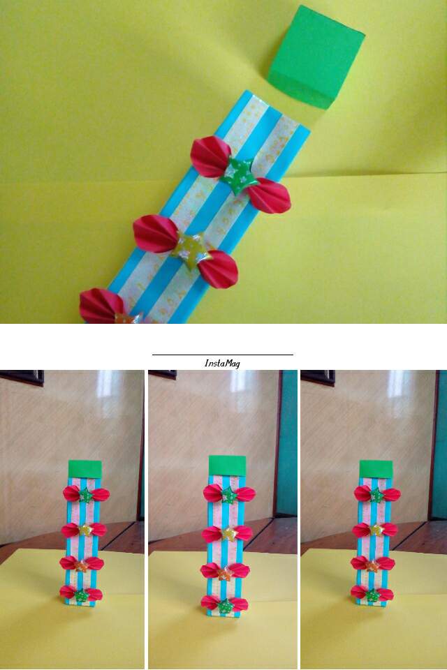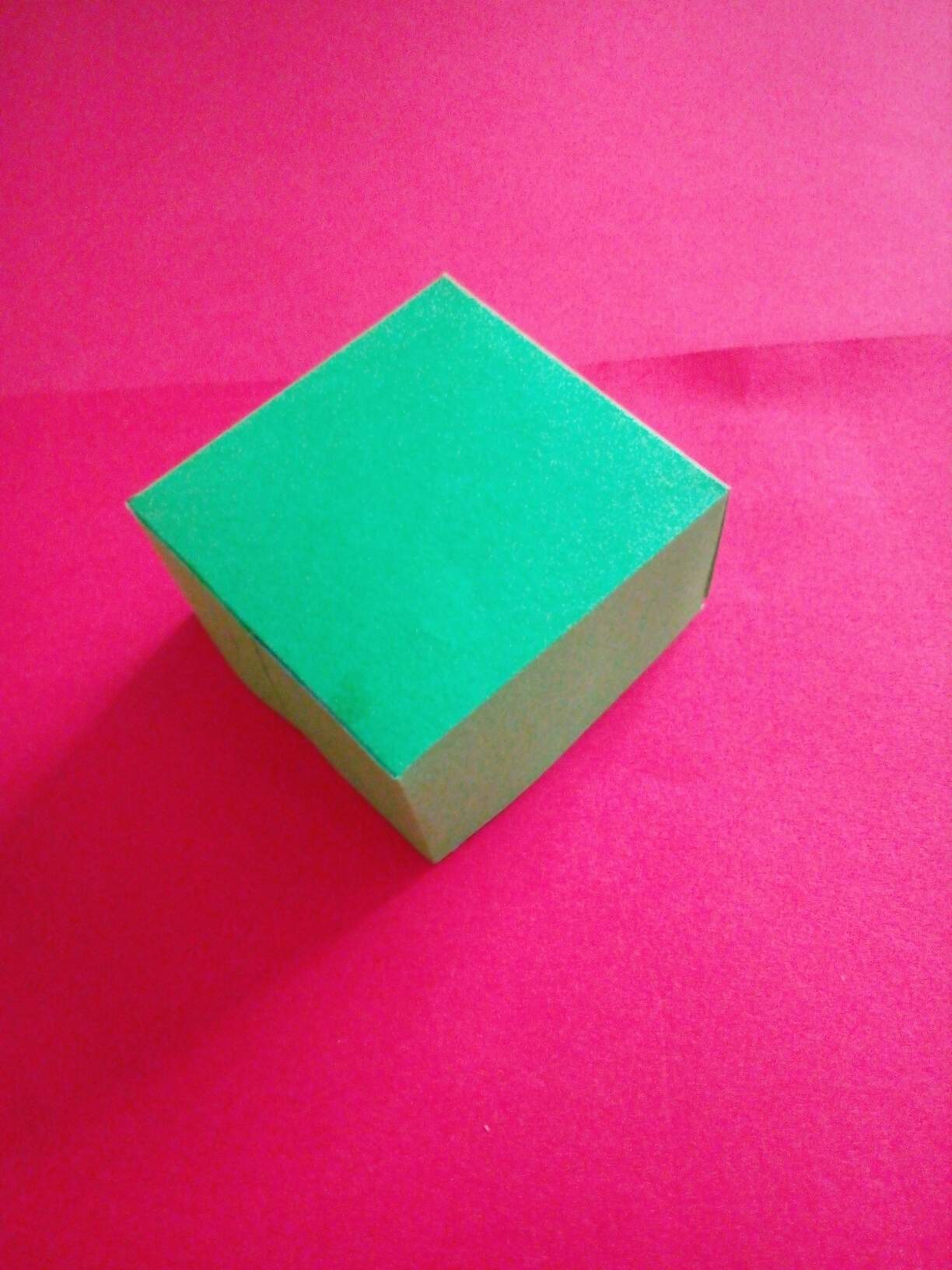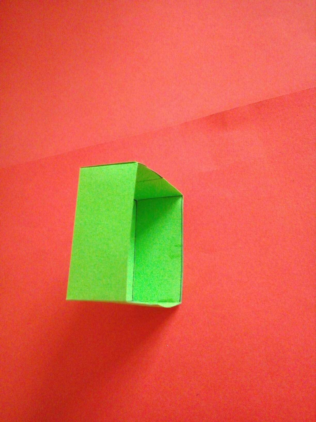 ပထမအဆင့်မှာစာရွက်ကိုအလျားအနံတူညီစွာဖြတ်ပြီး၊အညီအမျှသုံးပိုင်းခေါက်ပါတယ်။ဒီသုံးပိုင်းကိုတစ်ပိုင်းစီကိုတစ်ဝက်စီခေါက်ပါတယ်။ပြီးနောက်ထောင့်စွန်းကိုပုံအတိုင်းခေါက်ပြီး၊ခုနကခေါက်ထားတဲ့ကော်လံတစ်ခုစီကိုပုံအတိုင်းအဆင့်ဆင့်အဆုံးထိခေါက်ပြီးခေါက်ချိုးမျဥ်းယူလိုက်ပါတယ်။ပြီးနောက်ဘေးဘက်ကိုကော်လံတစ်ခုစာခေါက်မယ်။အပေါ်ဘက်ကိုတစ်လက်မခေါက်မယ်။ကျန်တစ်ဘက်ကို1cmခေါက်၍၊ခေါက်ချိုးမျဥ်းအတိုင်းလေးထောင့်ပုံစံရအောင်ခေါက်၍အဆုံးမှာကော်ကပ်ပါတယ်။တစ်လက်မခေါက်ထားတဲ့တစ်ဘက်မှာခေါက်ချိုးမျဥ်းအတိုင်းပုံအတိုင်းခေါက်လိုက်တယ်။boxရဲ့မျက်နှာတစ်ခုစီမှာအခြားစာရွက်အပိုင်းငယ်နှစ်ခုစီကော်ကပ်ထားလိုက်ပါတယ်။ပြီးနောက်အစိမ်းရောင်စာရွက်ဖြင့်တစ်ဘက်မှာထပ်မံပိတ်လိုက်ပါတယ်။ဘူးအဖုံးပြုလုပ်ရန်ဘူးရဲ့အရွယ်အတိုင်းမျဥ်းဆွဲ၍ဘေးဘက်လေးမျက်နာကိုအနည်းငယ်ပို၍ဘောင်ခတ်လိုက်ပါတယ်။ဆွဲထားတဲ့မျဥ်းအတိုင်းခေါက်လိုက်ပြီး၊အပြင်ဘက်ဘောင်မှာလိုအပ်သလိုဖြတ်ပြီး၊ကော်ကပ်၍အဖုံးပြုလုပ်လိုက်ပါတယ်။