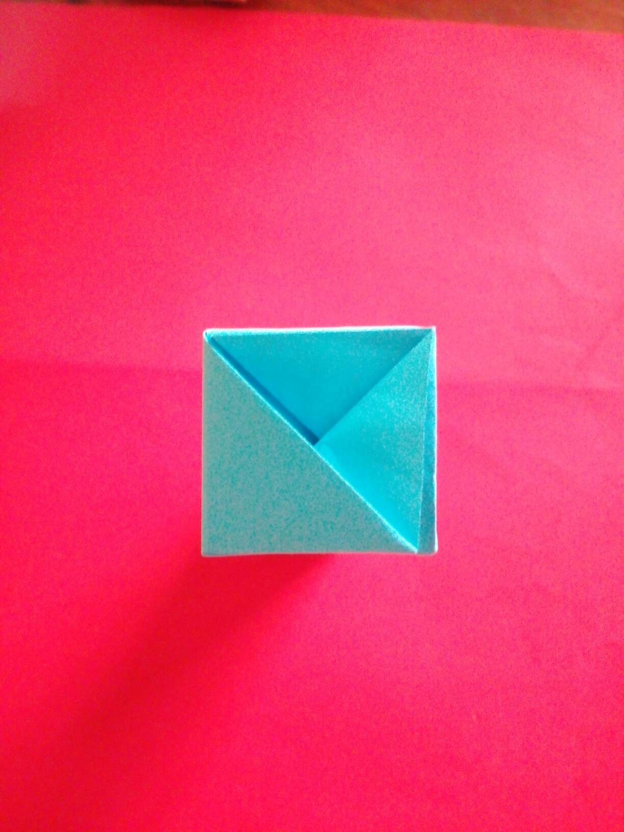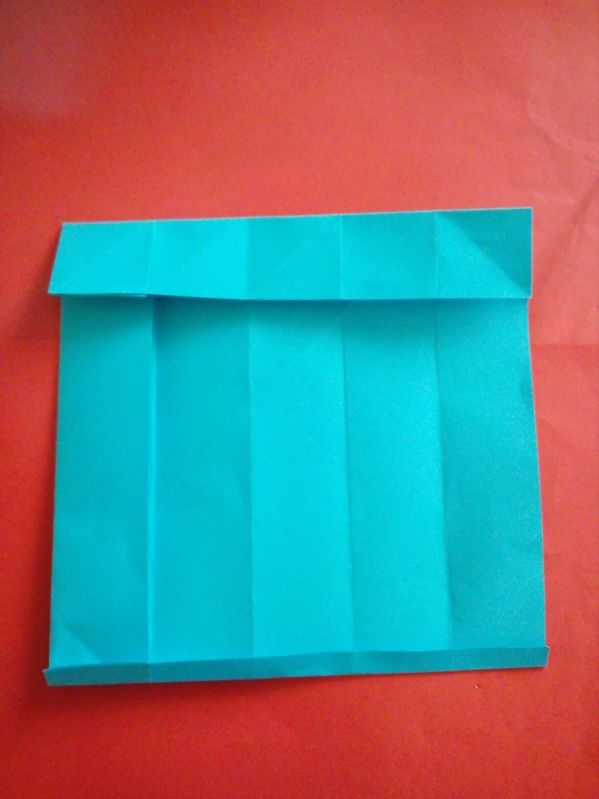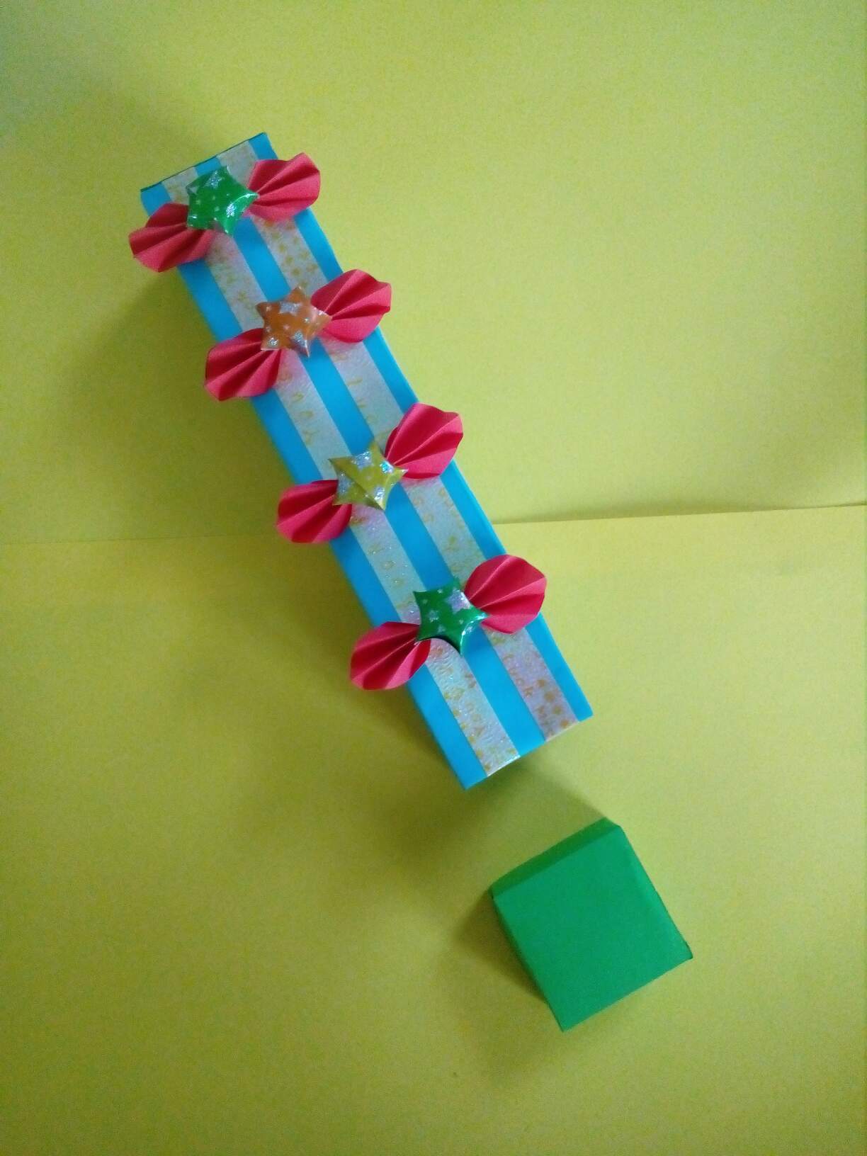 ပထမအဆင့်မှာစာရွက်ကိုအလျားအနံတူညီစွာဖြတ်ပြီး၊အညီအမျှသုံးပိုင်းခေါက်ပါတယ်။ဒီသုံးပိုင်းကိုတစ်ပိုင်းစီကိုတစ်ဝက်စီခေါက်ပါတယ်။ပြီးနောက်ထောင့်စွန်းကိုပုံအတိုင်းခေါက်ပြီး၊ခုနကခေါက်ထားတဲ့ကော်လံတစ်ခုစီကိုပုံအတိုင်းအဆင့်ဆင့်အဆုံးထိခေါက်ပြီးခေါက်ချိုးမျဥ်းယူလိုက်ပါတယ်။ပြီးနောက်ဘေးဘက်ကိုကော်လံတစ်ခုစာခေါက်မယ်။အပေါ်ဘက်ကိုတစ်လက်မခေါက်မယ်။ကျန်တစ်ဘက်ကို1cmခေါက်၍၊ခေါက်ချိုးမျဥ်းအတိုင်းလေးထောင့်ပုံစံရအောင်ခေါက်၍အဆုံးမှာကော်ကပ်ပါတယ်။တစ်လက်မခေါက်ထားတဲ့တစ်ဘက်မှာခေါက်ချိုးမျဥ်းအတိုင်းပုံအတိုင်းခေါက်လိုက်တယ်။boxရဲ့မျက်နှာတစ်ခုစီမှာအခြားစာရွက်အပိုင်းငယ်နှစ်ခုစီကော်ကပ်ထားလိုက်ပါတယ်။ပြီးနောက်အစိမ်းရောင်စာရွက်ဖြင့်တစ်ဘက်မှာထပ်မံပိတ်လိုက်ပါတယ်။ဘူးအဖုံးပြုလုပ်ရန်ဘူးရဲ့အရွယ်အတိုင်းမျဥ်းဆွဲ၍ဘေးဘက်လေးမျက်နာကိုအနည်းငယ်ပို၍ဘောင်ခတ်လိုက်ပါတယ်။ဆွဲထားတဲ့မျဥ်းအတိုင်းခေါက်လိုက်ပြီး၊အပြင်ဘက်ဘောင်မှာလိုအပ်သလိုဖြတ်ပြီး၊ကော်ကပ်၍အဖုံးပြုလုပ်လိုက်ပါတယ်။