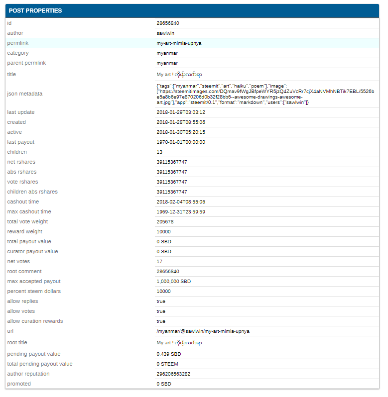 ထိုသို႔ vote အေျခအေနႏွင့္ Curation Reward ကို စစ္ေဆးျပီးပါက ၄င္း post ၏ အေသးစိတ္အေျခအေနကိုလည္း ေအာက္ပါအတုိင္း ေတြ႕ျမင္ႏုိင္ပါသည္။