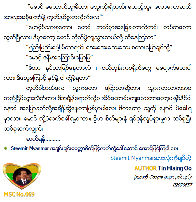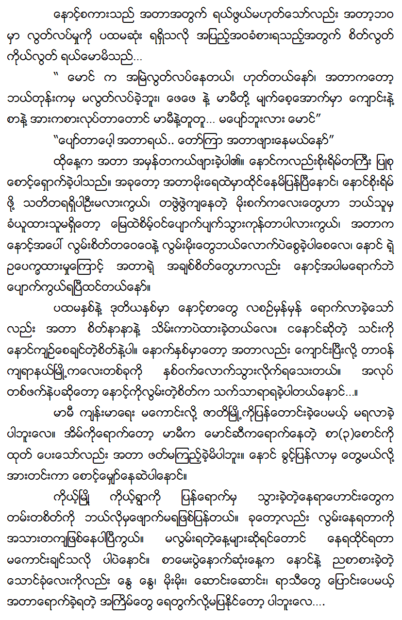 ဆရာဇာတ္ေကာင္းထဲက ေယာက္်ားေလးရဲ႕ ဆံုးျဖတ္ခ်က္ ျပတ္သားမႈကေတာ့ စံထားေလာက္ပါတယ္။ဆက္လက္ေစာင့္ေမ်ွာ္ဖတ္ပါ့မယ္ဆရာ။