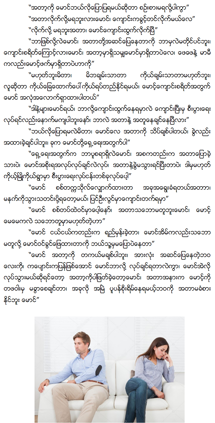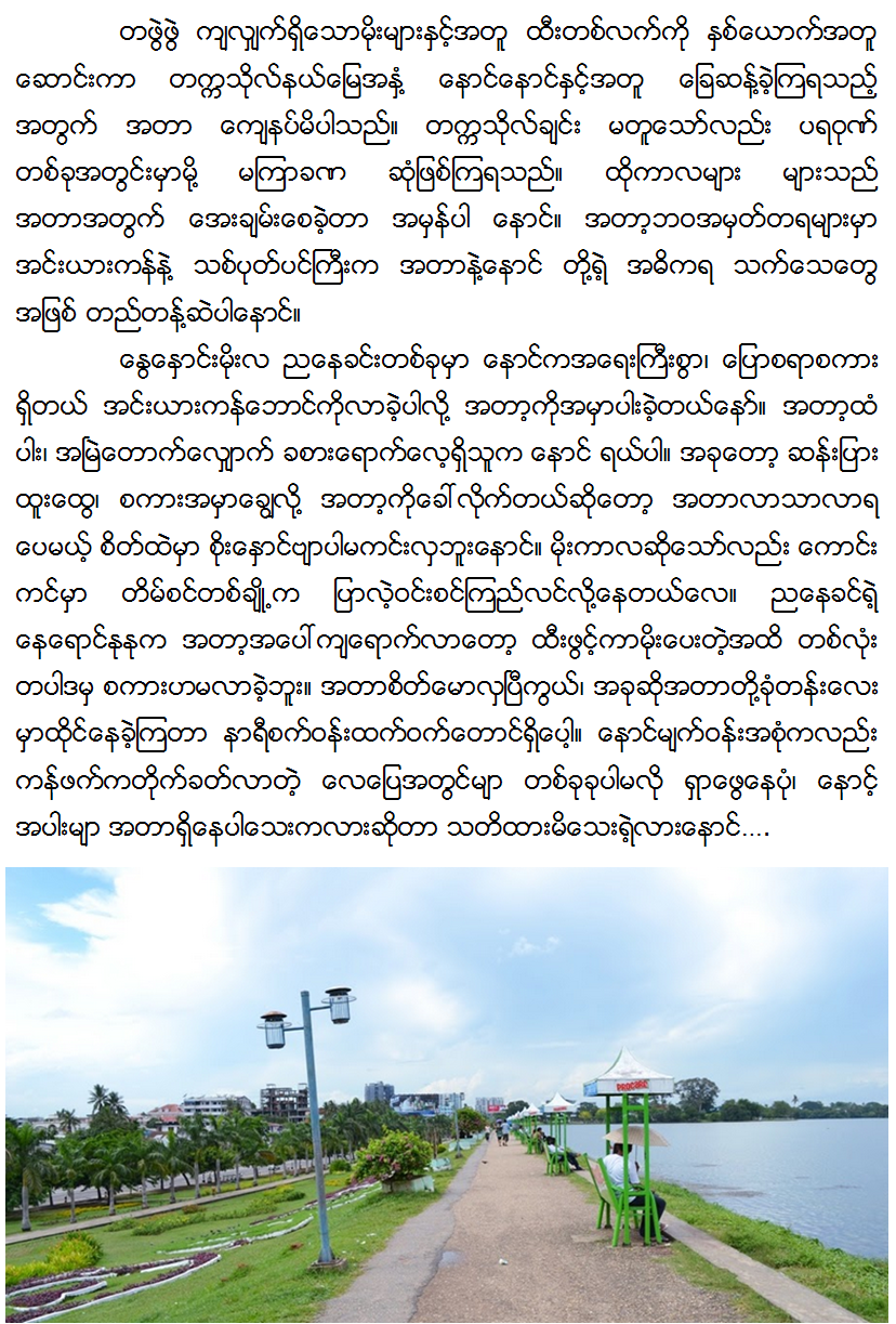 မွန္တယ္ဆရာေရ အခ်စ္နဲ႔မကင္းသမွ်ေသာကမကင္းနိုင္ဘူး။အခ်စ္နဲ႔ကင္းဖို႔ဆိုတာလဲခက္ခဲလြန္းတယ္။အတာအေယာက္အဒီခံစားခ်က္ႀကီးကိုပိုက္ျပီးအသက္ငါးဆယ္ထိေနနိုင္တာပင္ပန္းလြန္းတယ္ေနာ္။