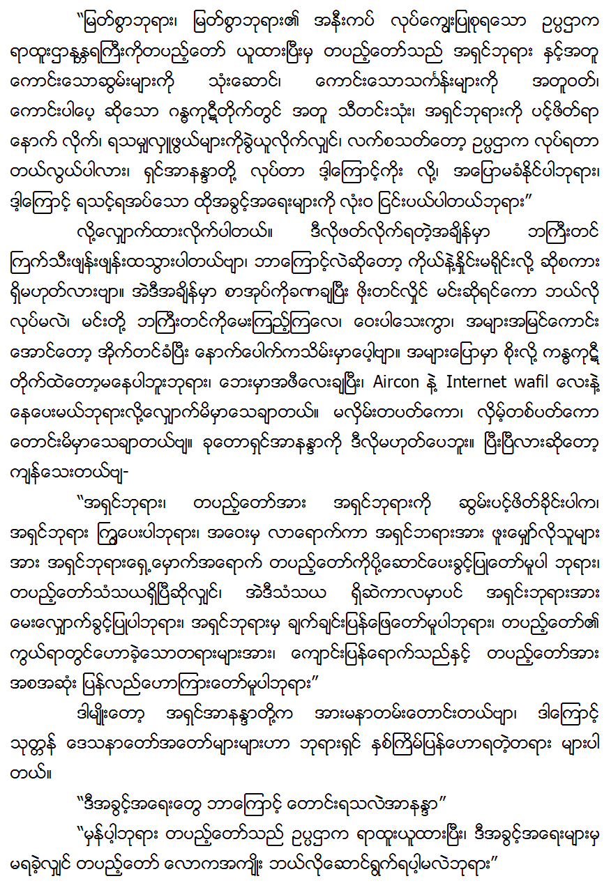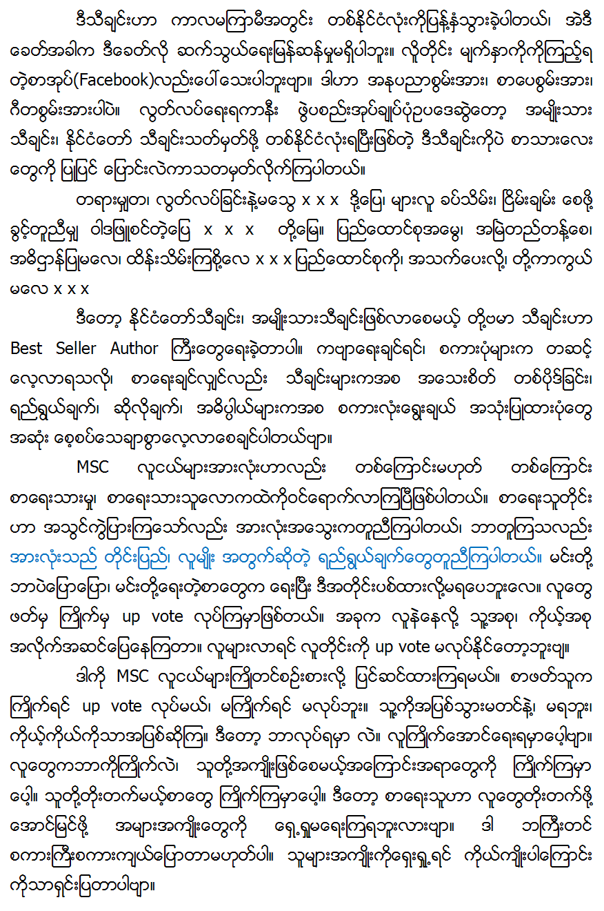 စာမ်ားမ်ားဖတ္သားေရ၊ စာေရးျခင္းအလုပ္က ခြန္အားမလုိဘူး၊ ဥာဏအားပဲလုိတာ၊ မေသမခ်င္းလုပ္လုိ႔ရတယ္၊ သိတဲ့အခ်ိန္မွာ ေနာက္မက်ဘူး။