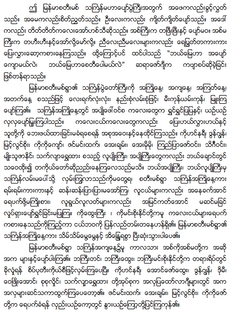 ဒီေန႔မီးပ်က္ေနလုိ႔ စာအုပ္နဲ႔ခ်ေရးရေတာ့တာေမာင္၊ မီးလာေတာ့ (၈)နာရီေက်ာ္ေနၿပီ မီေအာင္ကမန္းကတမ္းစာရုိက္ျပန္ကုိမစစ္ႏုိင္ပဲတင္ရေတာ့တာ။