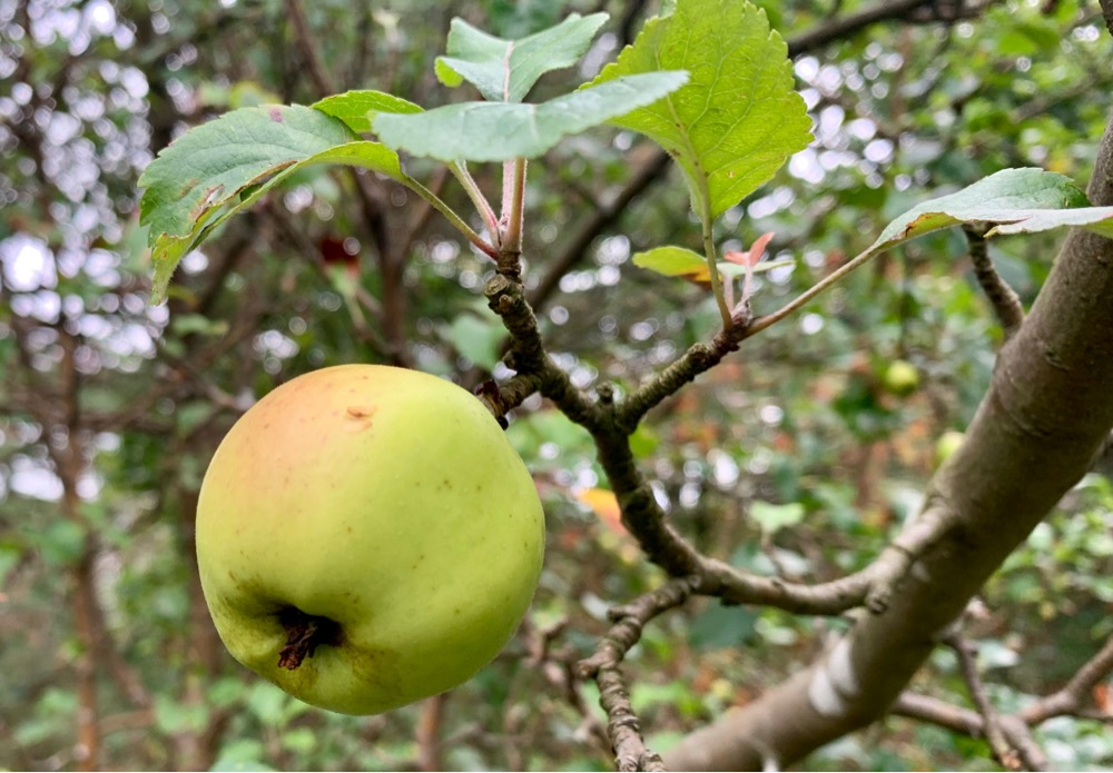Wild apple working on getting ripe on the branch.
