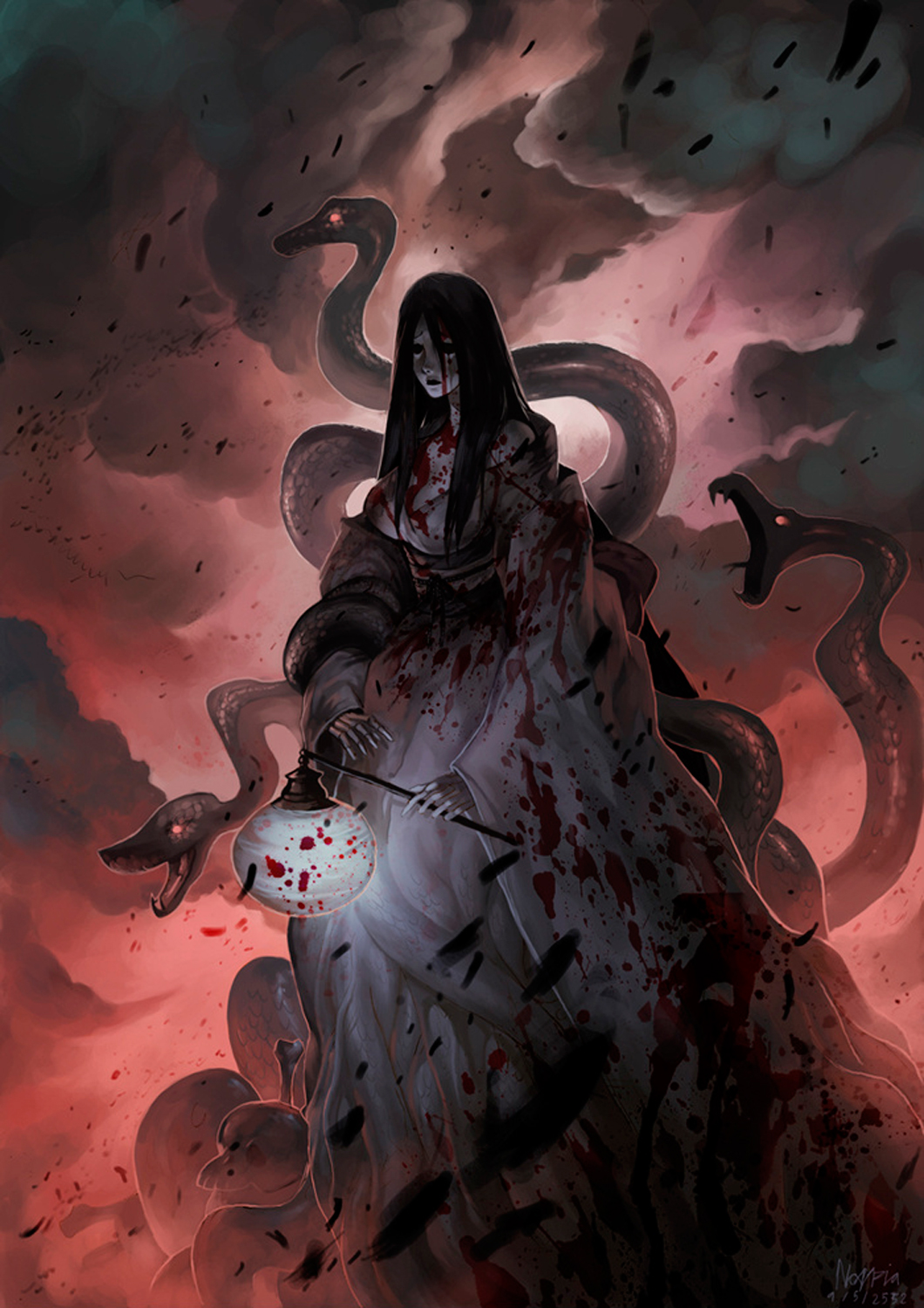 Izanagi couldn't live without his love and went to return her. In the darkness he heard the voice of his wife, who told him that it's too late to change anything, then Izanagi lit a torch to take the last look at his beloved. Instead her he saw a monster, dripping with pus and surrounded by monsters, the goddess attacked him. But Izanagi could to escape and close the entrance to the land of the dead with a huge rock. At that moment, he felt the presence of Izanami on the other side of the rock and asked her to dissolve their union. Izanami replied that in this case, she will strangle all the people in one day, but Izanagi replied that he was ready to build in a day fifteen hundred houses for pregnant women.