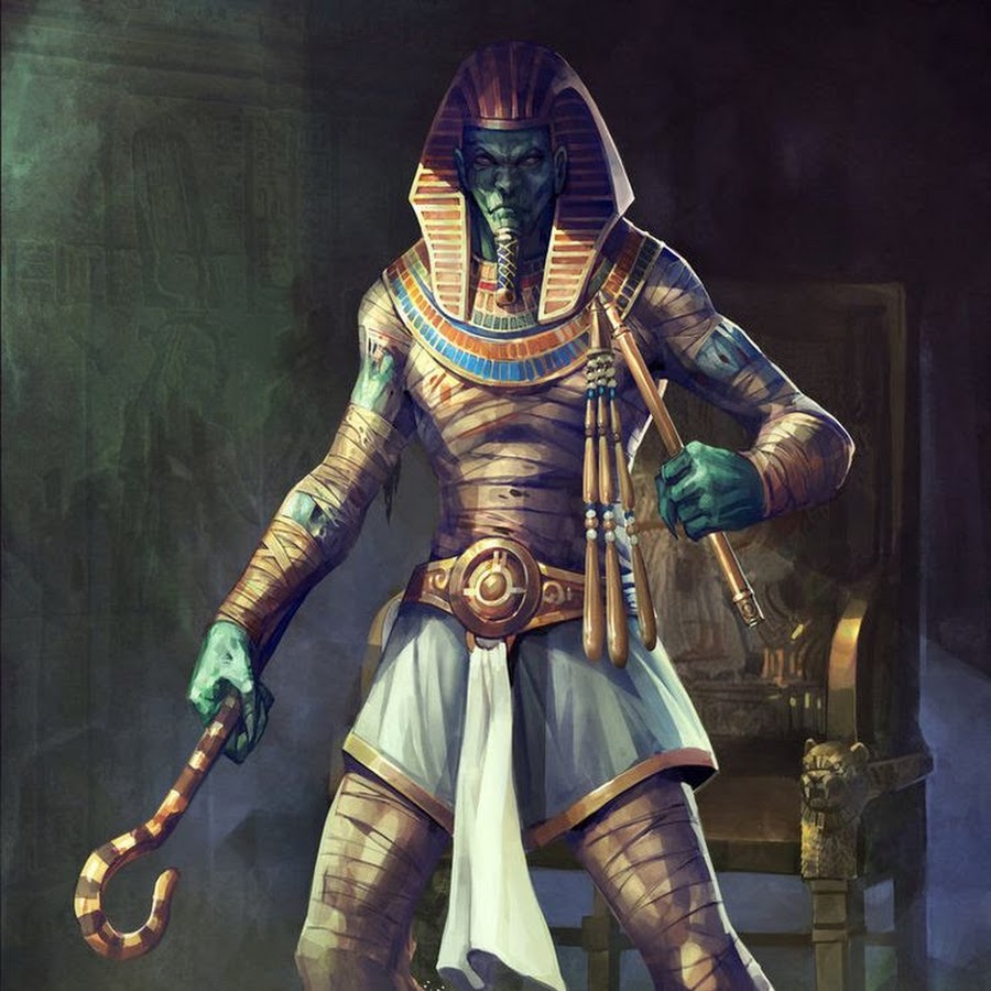 The God of rebirth and the king of the underworld. Initially, Osiris as a son of the Supreme God RA, lived on earth and ruled Egypt, he taught people agriculture, horticulture and construction. But was killed by his brother Seth, because of envy. After the resurrection of Osiris by his wife and the God Anubis, he decided to rule in the underworld. The image of Osiris is the result of his resurrection through embalming: depicted as a mummy with green face wrapped in a shroud, with hands, holding symbols of Royal power.