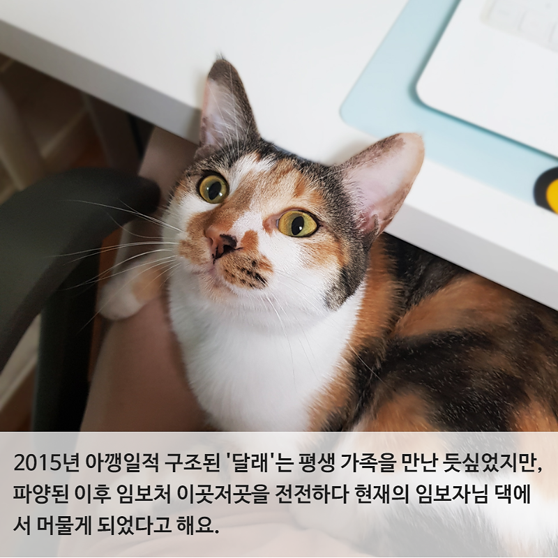 2015년 아깽일적 구조된 '달래'는 평생 가족을 만난 듯싶었지만, 파양된 이후 임보처 이곳저곳을 전전하다 현재의 임보자님 댁에서 머물게 되었다고 해요.
