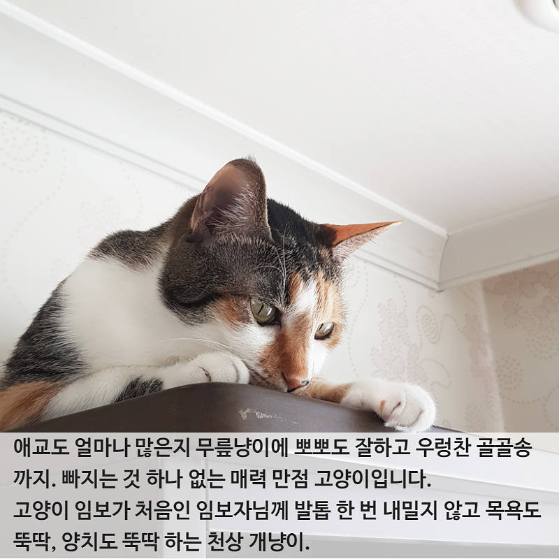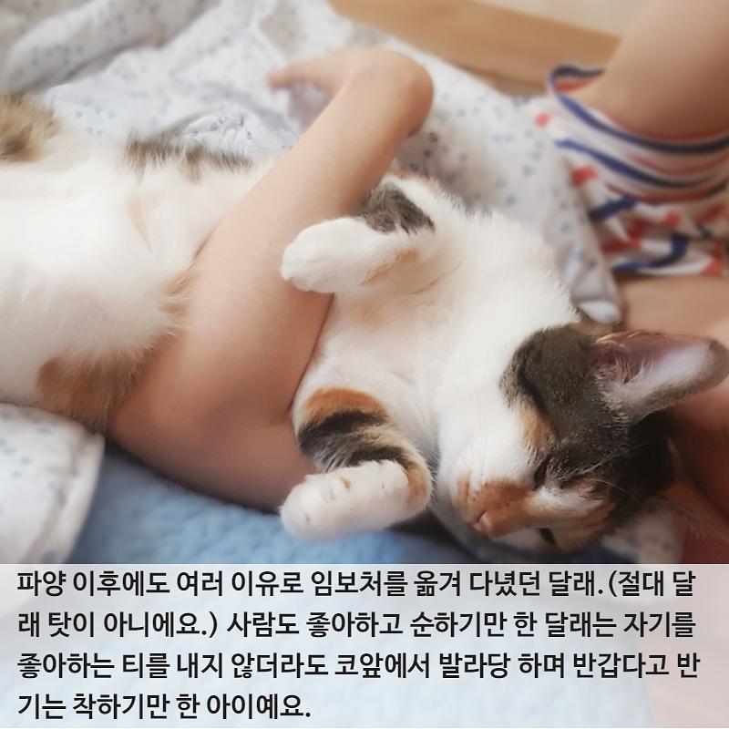 고양이 임보가 처음인 임보자님께 발톱 한 번 내밀지 않고 목욕도 뚝딱, 양치도 뚝딱 하는 천상 개냥이. 이렇게 예쁜 삼색이 달래가 왜 아직 가족을 만나지 못했는지 그저 의문이기만 해요.