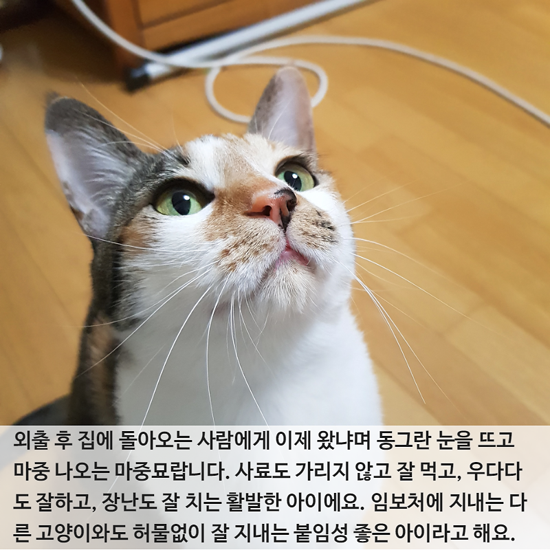 사료도 가리지 않고 잘 먹고, 우다다도 잘하고, 장난도 잘 치는 활발한 아이에요. 임보처에 지내는 다른 고양이와도 허물없이 잘 지내는 붙임성 좋은 아이라고 해요.