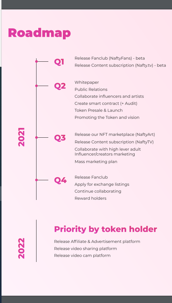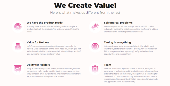 The Nafty platform is developed to use blockchain technology for full solutions to the adult industry. The major aim is the both empower the content makers and rewards content users across the Nafty ecosystem. It is a 360° social adult entertainment network for blockchain generation.