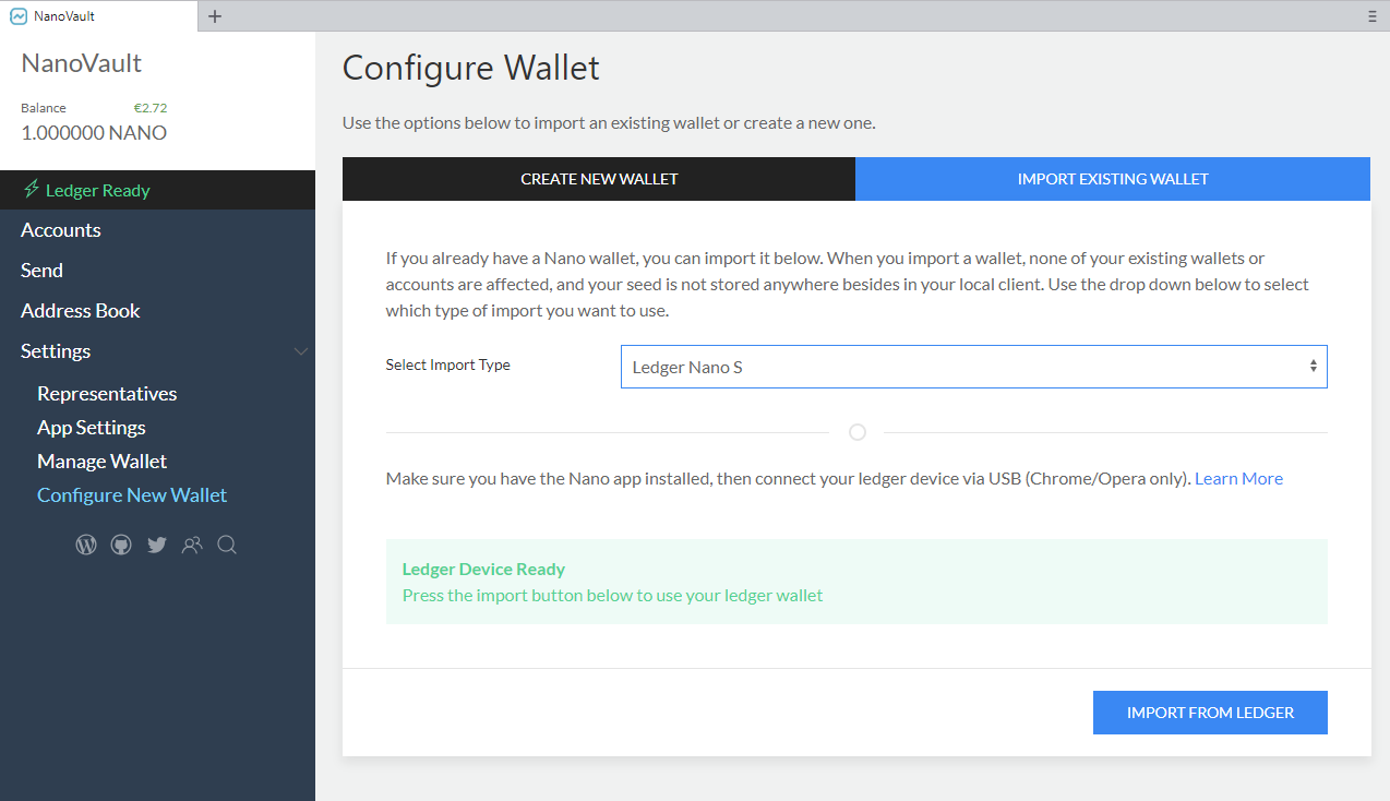 I've used the online wallet service https://nanovault.io/configure-wallet to make a new wallet which is secured by confirmations and a signature on the Ledger Nano S hardware wallet. This is the preferred way to store your cryptographic keys that allow access to your savings or cryptoassets.