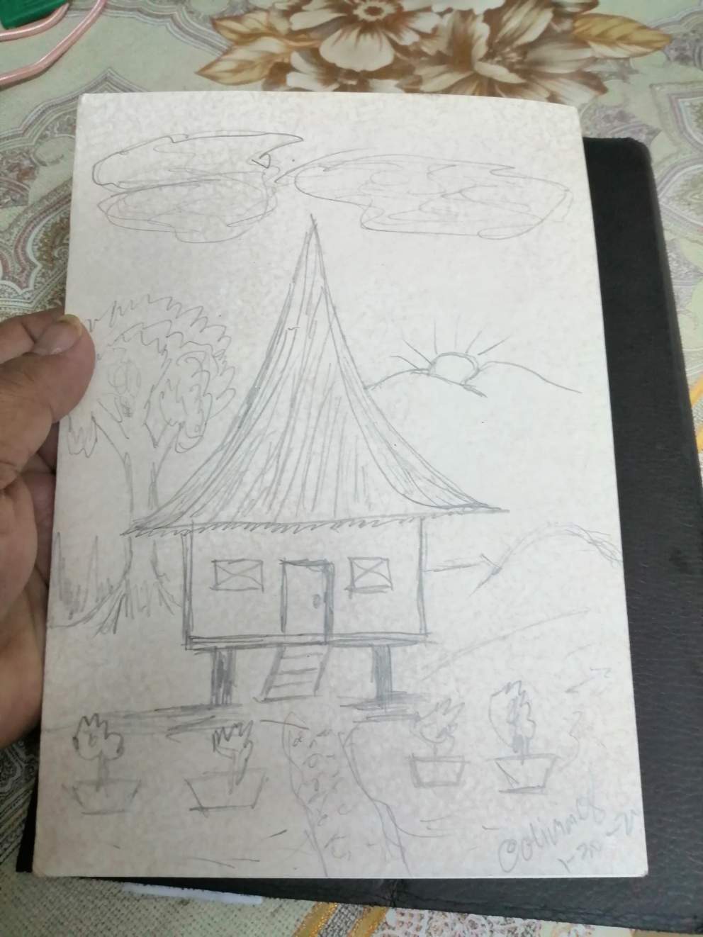 This is my drawing today, early in the morning. I am living in my employer's mansion for 10 years now and 12 years in their house. But my dream of living like the way I used my childhood life is here inside of me. That is the dream house before I die.