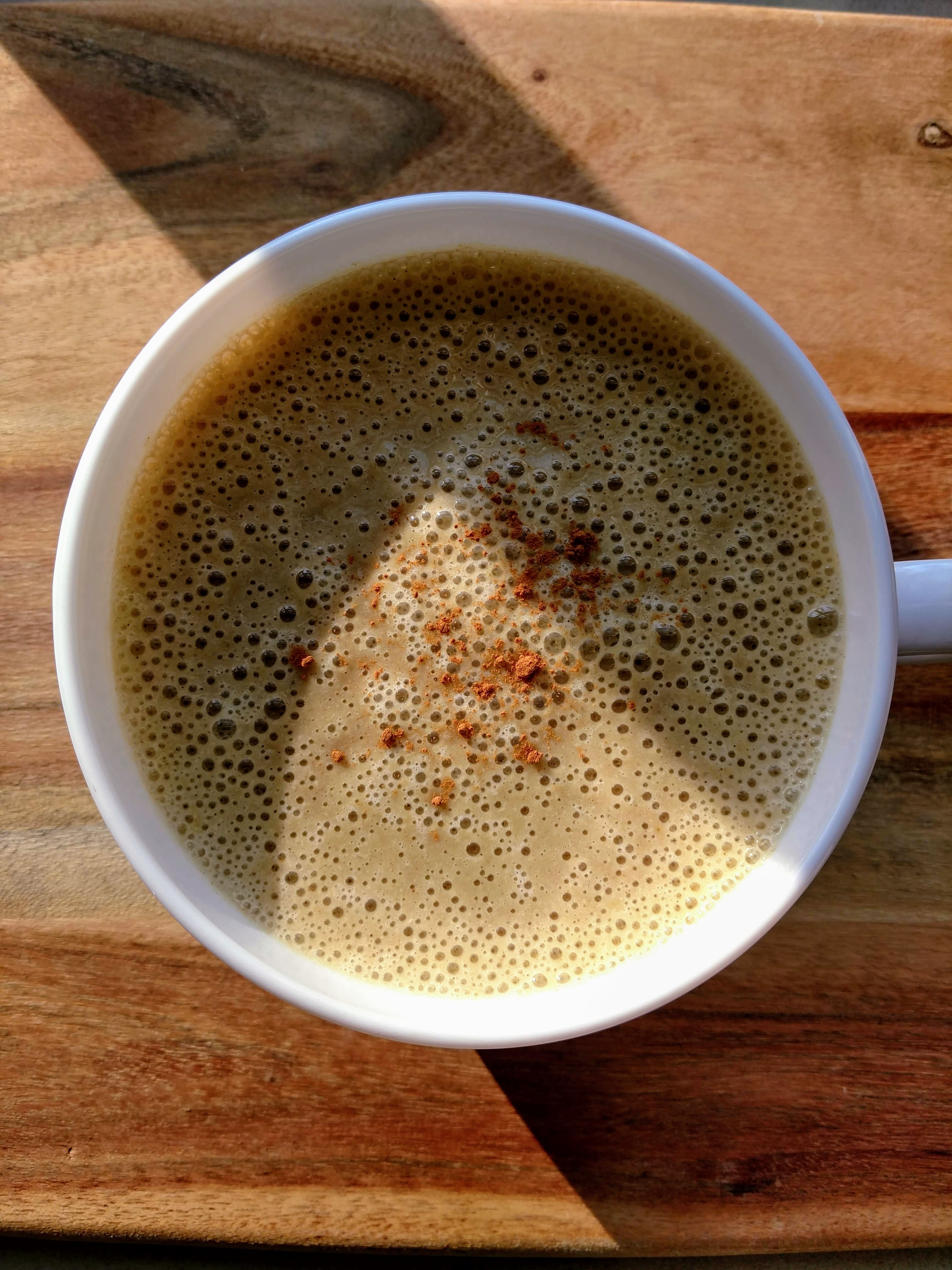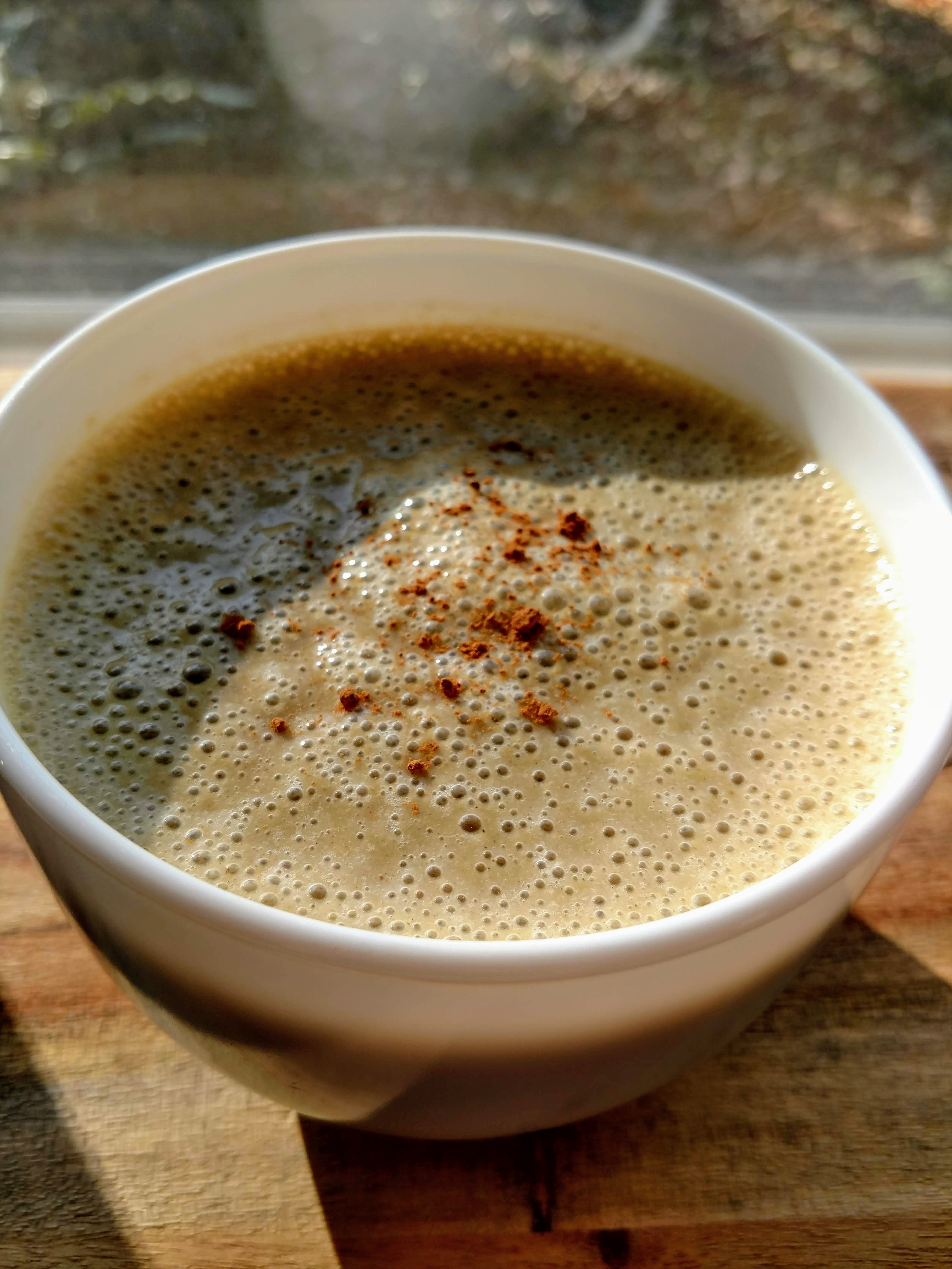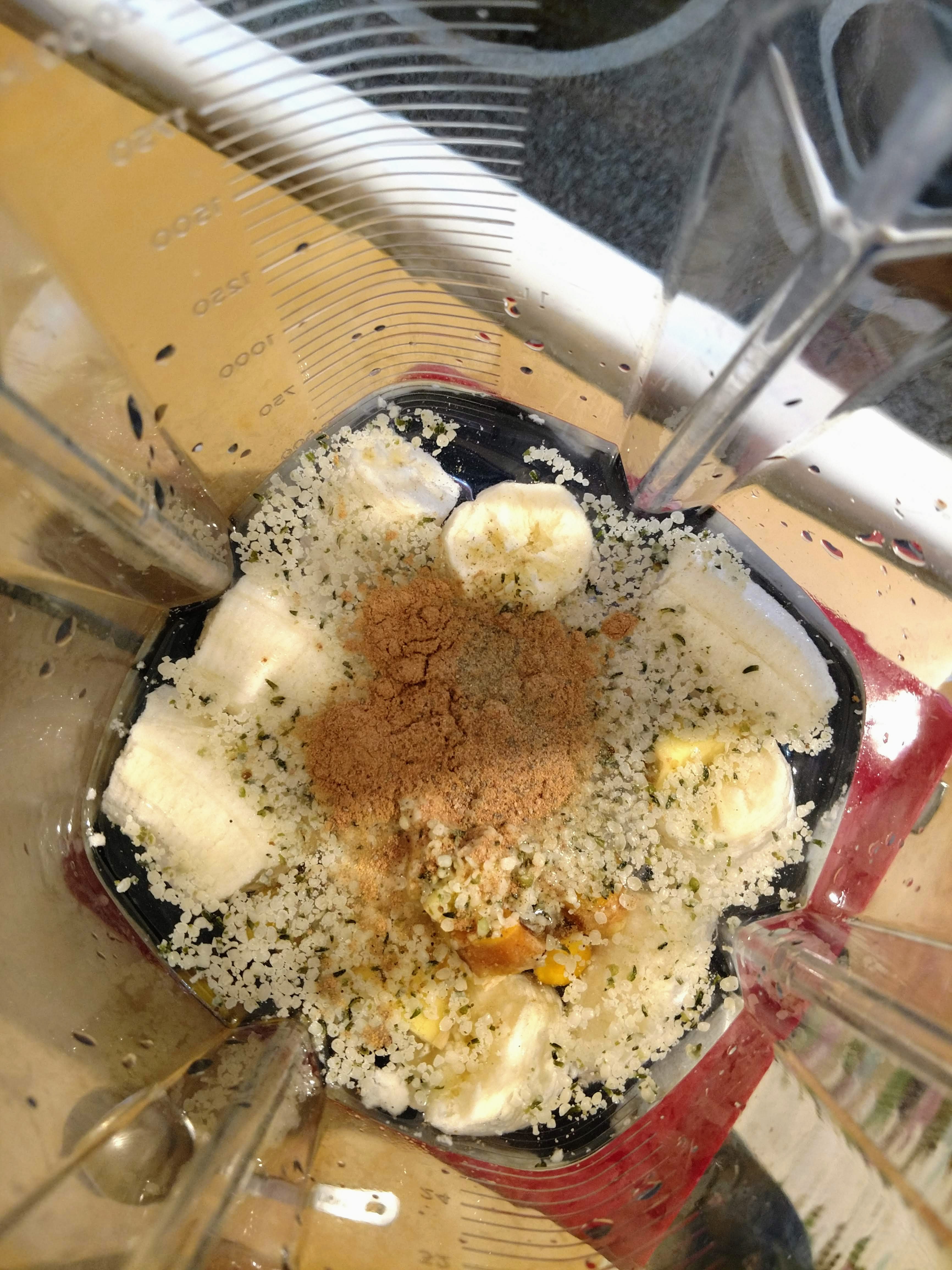 Into the blender went about half of my sticky date mixture (probably about 6-7 dates whole). Along with 1 cup of filtered water, 2 small bananas, a tablespoon of hemp hearts, a little nub each of fresh turmeric and ginger (about half the size of your pinky finger), a quarter teaspoon of ground cinnamon and a good pinch of black pepper. Since it is cold out, I decided to keep the blender going for a few minutes to warm up my shake. So in essence it was almost like a yummy coffee-free latte!