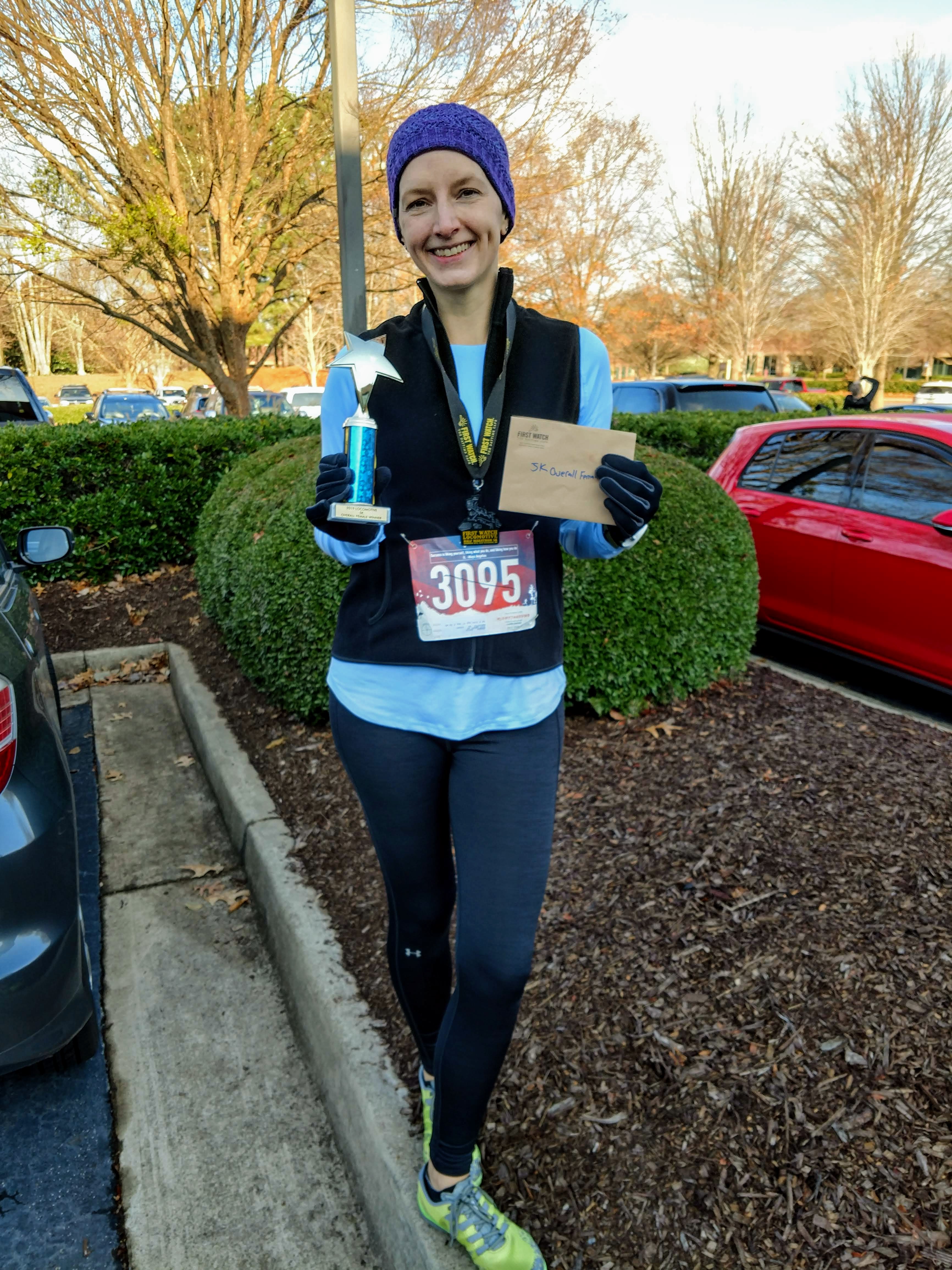 My legs did not feel their absolute best and I struggled a little bit to get my usual easy stride going (the work holiday party at the bowling alley the night before might have contributed), but I ran my little tushy off! I knew from the start there were no other ladies ahead of me, so the entire race I just kept pushing as hard as I could to not lose the lead. As I've said before, I always just want to do my best on a given day, but I can't help but have that competitive side come out on occasion to push me to do just that. 😜